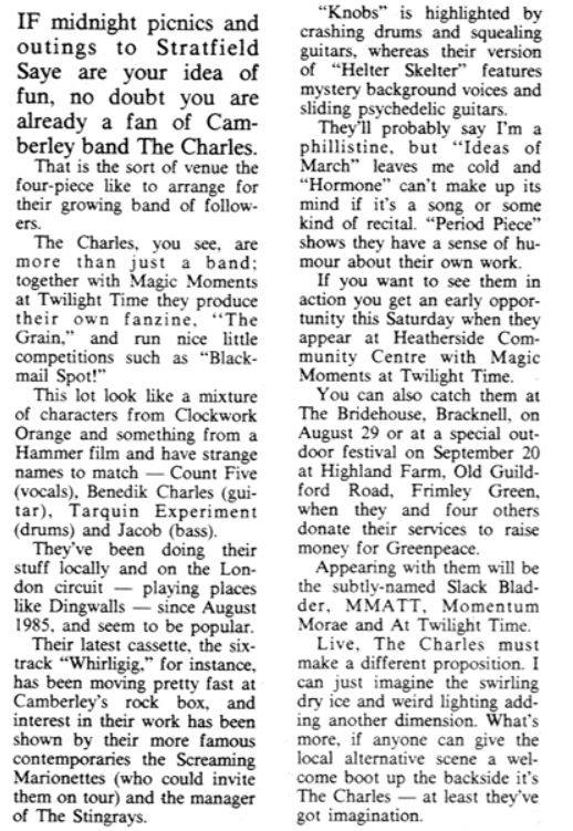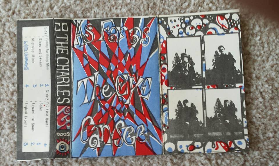 Formed by, ex-members of The Activities, Williams and Merrick, in early ’85 they were joined by Parlour shortly after, followed by former Lethal Dose and Panzer Korps vocalist Carter in August ’85. Over the next two years three demo cassettes were released and a collaborative release with Magic Moments at Twilight Time (MMATT). The first was ‘A View From A Boiler’ in May ’86, the 6 track (including “Knob”. Ides of March” and “Helter Skelter”). Then, released on 6 May ’87, ‘The Charles with Magic Moments A.T.T.’ carried the track “Mick & Chris On Acid”, the first collaboration MMATT did with The Charles. The Community Centre, Frimley hosted the band and MMATT on 27 June ’87 and a month later ‘The Whirligig Cassette’ came along. On 22 August that year The Charles and Magic Moment at Twilight Time were at Heatherside Community Centre, with The Charles hitting The Bridge House, Bracknell seven days later. The collaboration known as The Grain, of which The Charles were a part, organized an outdoor festival at Highlands Farm, Frimley Green on 20 September to raise funds for Greenpeace. Along with The Charles, MMATT, Slack Bladder; Momentum Mori, Greed and At Twilight Time appeared. Then in November ’87 the 8 track cassette album ‘As Far As The Eye Can See’ hit the streets. Three of the bands tracks were feature on “Mick & Chris On Acid…The Album!” and a live set was released, on cassette and given away free to compensate fans for a cancelled gig, called ‘Live…and Sorry’.