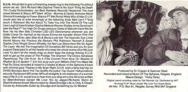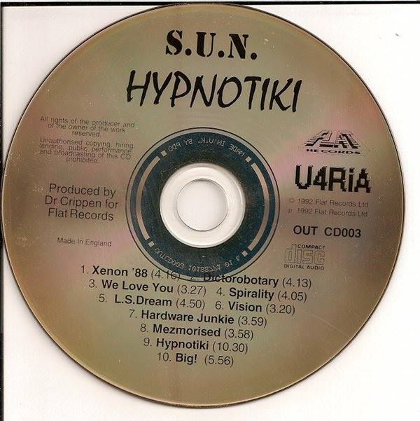 In Jan ’91 the band searched for a new female singer, finding Antoinette ?, and released the 12″ version of their debut single “We Love You”, a cover of the Jagger / Richards song, again on Flat Records. S.U.N. supported The Candyskins, along with The Pocket Devils, at Splash, Water Rats, Kings Cross on 29 May ’91. In October that same year they released the “Results of Reasoning” E.P. which reached No.194 in the charts. They went on to release the “Hypnotiki” LP in ’92. This was recorded and mixed at Music of the Spheres, Reigate and featured Smudge of guitar, and scratching by DJ Modest.