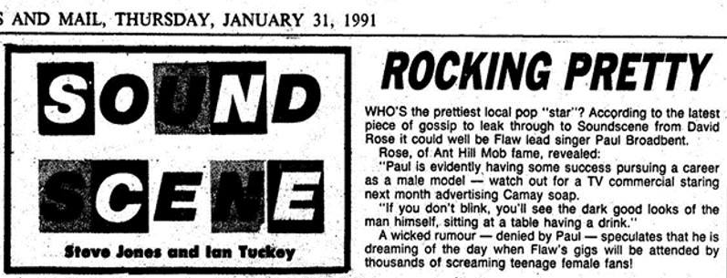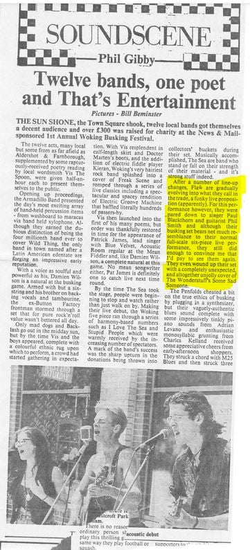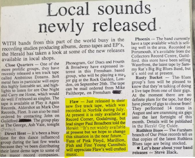 In late 1990 this 6-piece band released a 5-track demo cassette, recorded at a studio in Norfolk that July. This Flaw demo turned out to be the first reviewed by Steve Hack for the Farnham Herald. It was only available from Record Corner, Godalming. The band went through a number of line-up changes, with Broadbent and Smith the only true constants. On 25 July ’92 they participated in the Woking: News & Mail’s 1st Annual Busking Festival. Reportedly Broadbent pursued a modeling career. appearing in an advert for Camay .