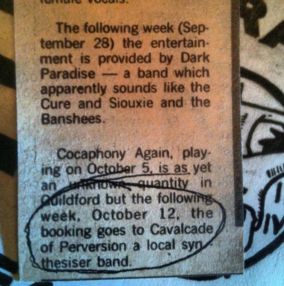 Murray, who had also been in Creatures of Darkness and Screaming Lullabies, got together with Hayllor and Block to form Cavalcade of Perversion, a Guildford based synth band. In August ’83 the band were booked to play the ‘Animal House’ club at The Royal, Guildford. They would return to the venue in October ’83; an event referred to as the body bag gig by members of the band. This didn’t stop them from returning once more to the Animal House on 11 January ’84.