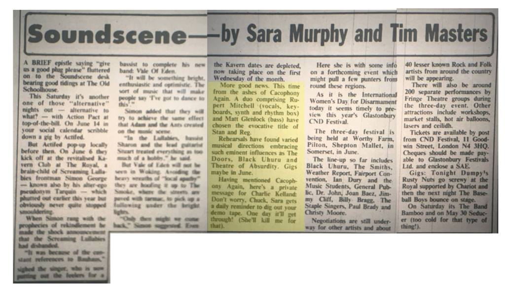Formerly known as The Recs, Cacophany Again recorded a demo tape at Catch 44 Studios, Godalming in late ’83 that featured “Squares of the City”. On 5 October ’83 the band were booked to play the ‘Animal House’ club at The Royal, Guildford. The band broke up in ’84 after their 4th Feb gig at The Royal, with The Photogenix in support; a gig described by Soundscene writer Tim Masters as ‘one of the weirdest gigs ever’. Bugged by feedback and an ‘ill-paced set’ Cacophany Again were replaced by their support by ‘Rock Club’ organizers Tony and Judith Sawyer.