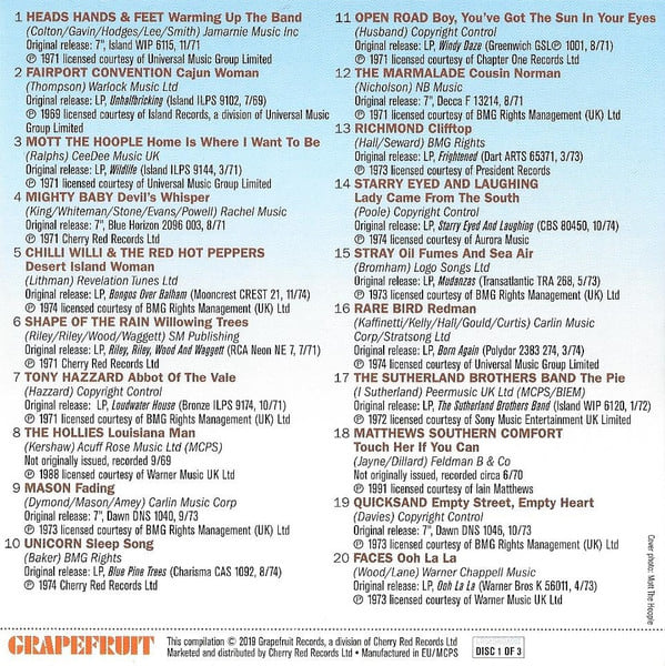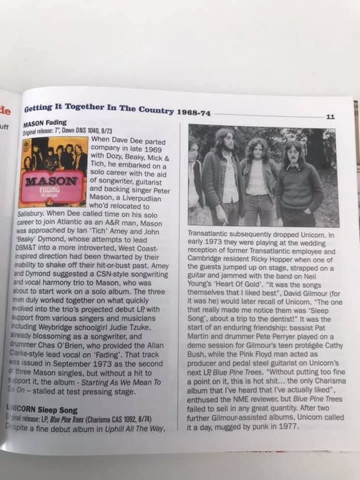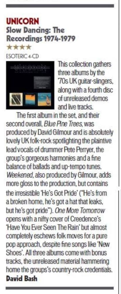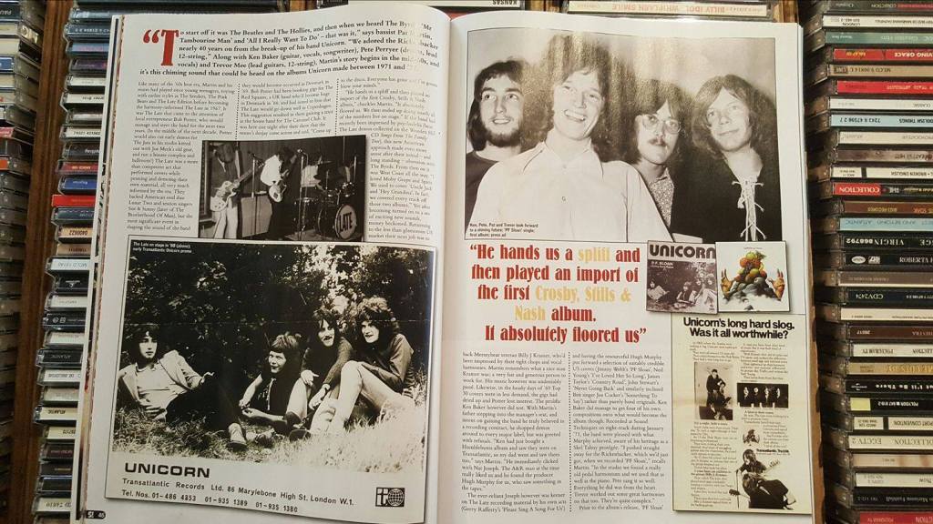 In ’19, Unicorn appear on disc one of the 3 CD box set “Across The Great Divide Getting It Together In The Country 1968-74”, and page 11 of the accompanying booklet, on Grapefruit Records [CRSEGBOX061]. Unicorn’s “Going Back Home” was included on Disc 1 of the 3 Disc “Peephole In My Brain – The British Progressive Pop Sounds Of 1971” compilation released by Cherry Red [CRSEG076T] on 21 August ’20. In ’21 Esoteric Recordings released a new 4 CD clamshell boxed set that gathered together three albums and an additional disc of previously unreleased archive material titled “Unicorn: “Slow Dancing – The Recordings 1974 – 1979”.