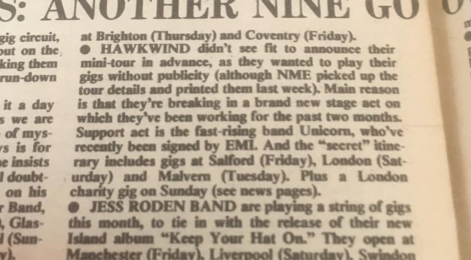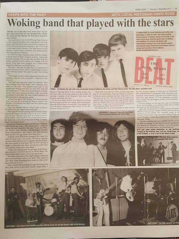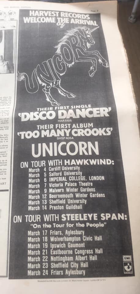 Unicorn signing to support Lunar Two…of whom we can find no trace.“Outstanding in their field” – Members and roadies of Unicorn in a field! [front to back: Mike Proctor (roadie), Pete Perryer, Pat Martin, and Alec Hawkins (roadie)]. Source: Michael Hood via Unicorn – The English BandClipped from the 3rd June 1976 issue of NME, Hawkwind’s short UK featured ‘fast rising’ Unicorn. Source: Chris Knight via Unicorn – The English BandUnicorn appear on disc one of the 3 CD box set “Across The Great Divide Getting It Together In The Country 1968-74” – disc one back cover pictured – on Grapefruit Records [CRSEGBOX061] released in 2019Unicorn appear on disc one of the 3 CD box set “Across The Great Divide Getting It Together In The Country 1968-74” – booklet page 11 pictured – on Grapefruit Records [CRSEGBOX061] released in 2019. Source: Matt Allen via Unicorn – The English BandUnicorn appear on disc one of the 3 CD box set “Across The Great Divide Getting It Together In The Country 1968-74” – disc one back cover pictured – on Grapefruit Records [CRSEGBOX061] released in 2019Unicorn appear on disc one of the 3 CD box set “Across The Great Divide Getting It Together In The Country 1968-74” – disc one back cover pictured – on Grapefruit Records [CRSEGBOX061] released in 2019Advert for Unicorn’s, Dave Gilmour produced single “Ooh Mother”, released on Charisma from NME’s 3 August 1974 issue. Source: Chris Knight via Unicorn – The English BandAdvert from NME, 6 March 1976, listing Unicorn’s tour dates with Hawkwind and Steeleye Span. Source: Chris Knight via Unicorn – The English BandClipping from the 28 February ’76 issue of NME, outlining Hawkwind’s 7 date tour supported by Unicorn. Source: Chris Knight via Unicorn – The English BandKen Baker hand wrote the lyrics of Unicorn’s “I Saw You” for Rebecca Turner, who does a version of the song. Picture courtesy of Pat MartinThe front cover of Castle Music’s 2007 release “Goodbye Nashville Hello Camden Town – A Pub Rock Anthology’ [CMEDD1451] which carried two Unicorn tracks.The back cover of Castle Music’s 2007 release “Goodbye Nashville Hello Camden Town – A Pub Rock Anthology’ [CMEDD1451] which carried two Unicorn tracks.3 May 1974: Unicorn supported John Martyn a with Danny Thompson at London Polytechnic.Unicorn’s “Slow Dancing: The Recordings 1976-1979”, released on Esoteric, got a 4-star review in the August 2020 issue of Shindig Magazine. Source: Pat Martin via Unicorn – The English BandUnicorn’s “Going Back Home” is included on Disc 1 of the 3 Disc “Peephole In My Brain – The British Progressive Pop Sounds Of 1971” compilation released by Cherry Red [CRSEG076T] on 21 Aug 2020.Side-A of UK test pressing of Unicorn’s “One More Tomorrow” from 1978. Picture courtesy of Ben’s Collector’s RecordsSide-B of UK test pressing of Unicorn’s “One More Tomorrow” from 1978. Picture courtesy of Ben’s Collector’s RecordsJanuary 1975: Melody Maker advert listing Unicorn as supporting John Entwistle’s OX. Source: Patrick Martin via Unicorn – The English BandDavid Rose looks back at Woking’s Pink Bears and their development, via The Late, into Unicorn in this Woking News & Mail article from 2 November 2017. Picture courtesy of Ben’s Collector’s RecordsA post ’67 Unicorn: (L-R) Ken Baker, Pete Perryer, Pat Martin, and Trevor Mee.Front sleeve of Unicorn 2. Picture courtesy of Ben’s Collector’s RecordsBack sleeve of Unicorn 2. Picture courtesy of Ben’s Collector’s RecordsUS pressing of “One More Tomorrow”. Picture courtesy of Ben’s Collector’s RecordsBack of US pressing of “One More Tomorrow”. Picture courtesy of Ben’s Collector’s RecordsUK Too Many Crooks Tour dates advert from ’77. Picture courtesy of Ben’s Collector’s RecordsStefan Grossman was touring to promotes his ‘Those Pleasant Days’ album in 1971 and was supported by UnicornAlong with Gillian McPherson, Unicorn supported Lindisfarne at RFH in ’71Unicorn 45 produced by Dave Gilmour. Unicorn Shindig Magazine May 2017 Article 4. Picture courtesy of Ben’s Collector’s RecordsPages 7 and 8 of Unicorn article in Shindig Magazine, May 2017. Picture courtesy of Ben’s Collector’s RecordsPages 5 and 6 of Unicorn article in Shindig Magazine, May 2017. Picture courtesy of Ben’s Collector’s RecordsPages 3 and 4 of Unicorn article in Shindig Magazine, May 2017. Picture courtesy of Ben’s Collector’s RecordsPages 1 and 2 of Unicorn article in Shindig Magazine, May 2017. Picture courtesy of Ben’s Collector’s RecordsCover of Shindig Magazine, May 2017 featuring Unicorn. Source issuu.comCover letter for payment for Kate Bush sessions. Source David Godden’s via Guildford Town Past & PresentB-side of Unicorn’s Blue Pine Trees LP of 1974. Picture courtesy of Ben’s Collector’s RecordsA-side of Unicorn’s Blue Pine Trees LP of 1974. Picture courtesy of Ben’s Collector’s RecordsCover of Unicorn’s Blue Pine Trees LP of 1974. Picture courtesy of Ben’s Collector’s RecordsShed No Tears CD cover front. Picture coutest of Ben’s Collector’s RecordsShed No Tears CD cover front. Picture coutest of Ben’s Collector’s RecordsA c’71 Unicorn press clipping from somewhere. Picture courtesy of Ben’s Collector’s RecordsFront of Unicorn promo for first album in ’71. Picture courtesy of Ben’s Collector’s RecordsBack of Unicorn promo for first album in ’71. Picture courtesy of Ben’s Collector’s RecordsThe Portuguese front sleeve of Unicorn’s first single “P.F. Sloan” from ’71The Portuguese back sleeve of Unicorn’s first single “P.F. Sloan” from ’71Unicorn’s touring band on 1976. Picture courtesy of Patrick MartinUnicorn’s Peter Perryer and Pat Martin at Dingwalls c’75. Picture courtesy of Patrick MartinUnicorn’s Ken Baker and Pat Martin at Dingwalls c’75. Photographed by Dave Williamson a