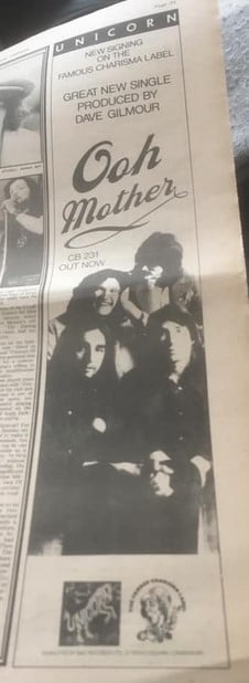 A tour of the US was also organized and Norman Whapshott and Frank Windsor became the bands permanent roadies. August ’74 saw Unicorn release the Gilmour produced single “Ooh Mother”, on Charisma. In November that year they hit the US to find “Blue Pine Trees” at #1 in the F.M. Action (airplay) chart and played their first US gig at the Whiskey a Go Go supported by Patti Smith, then three consecutive nights in Salt Lake City, Bozeman and Missoula supporting Fleetwood Mac. Other gigs on the tours saw then on the bill with Manfred Mann’s Earthband, Climax Chicago Blues Band, Camel, Doobie Brothers, Billy Joel (at the Cellar Door Club,Washington DC), Linda Ronstadt and Styx.
