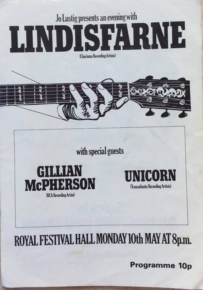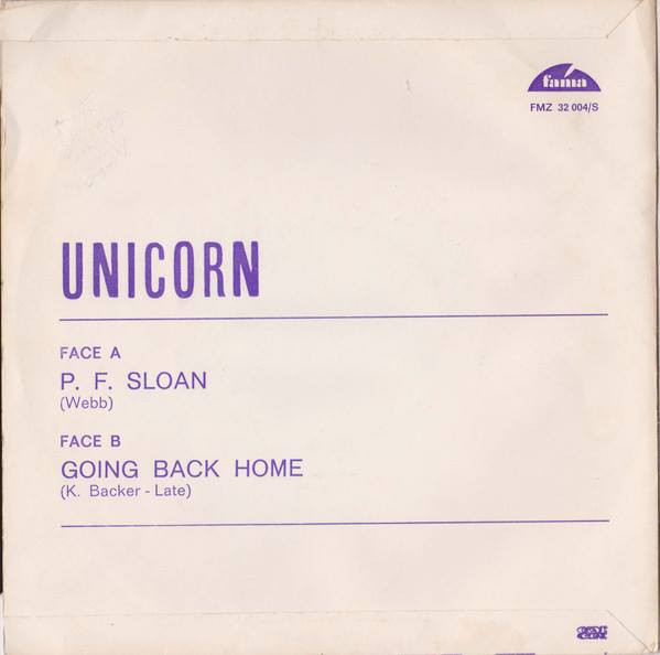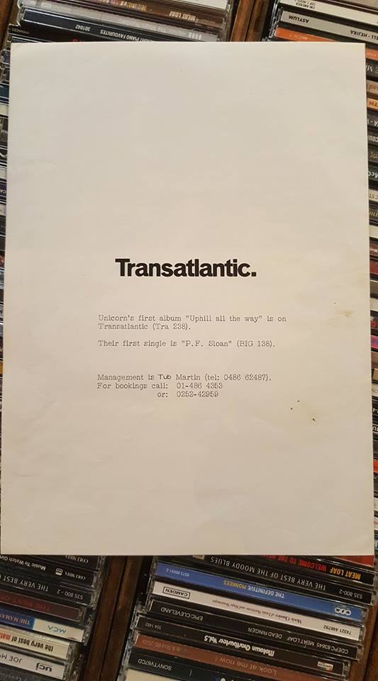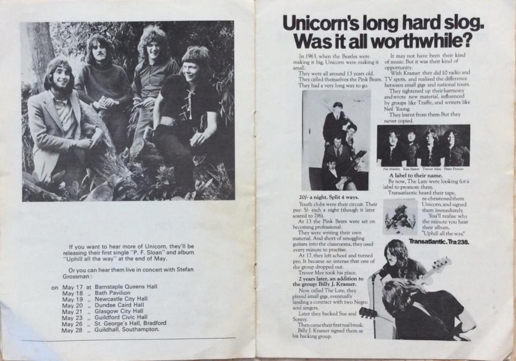 As The Late they recorded several acetates, demos and private recordings, some recorded in Bob Potters studio in Mytchett, Surrey on the Ampex 4 and many are now included on Wooden Hill Records compilation “Songs From The Family Tree” [WHCD021]. A demo was cut and the Transatlantic label offered a one album deal and “Uphill all the Way” was released in May ’71, along with the “P.F Sloan” single, under the band’s new name, Unicorn. Shortly before the release they opened for Lindesfarne at the Royal Festival Hall, London (May 10) and toured with Stefan Grossman in late May, including a gig at the Civic Hall, Guildford and appearing on his “Wow” album.