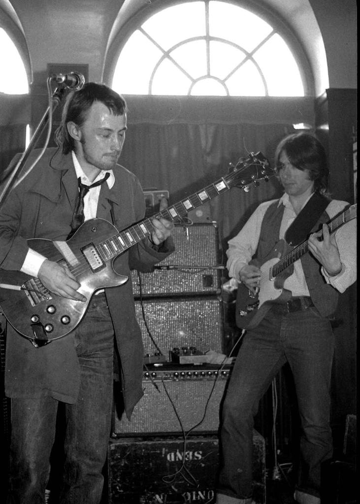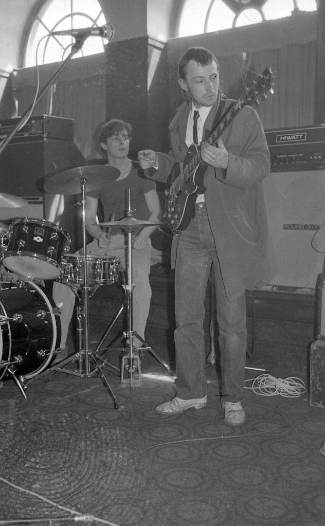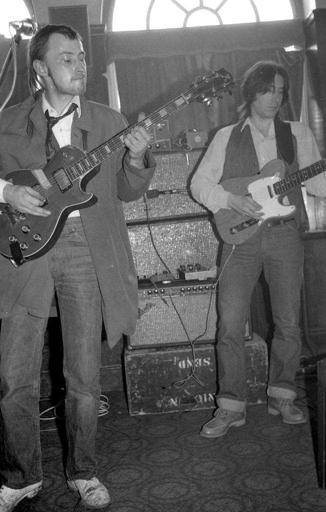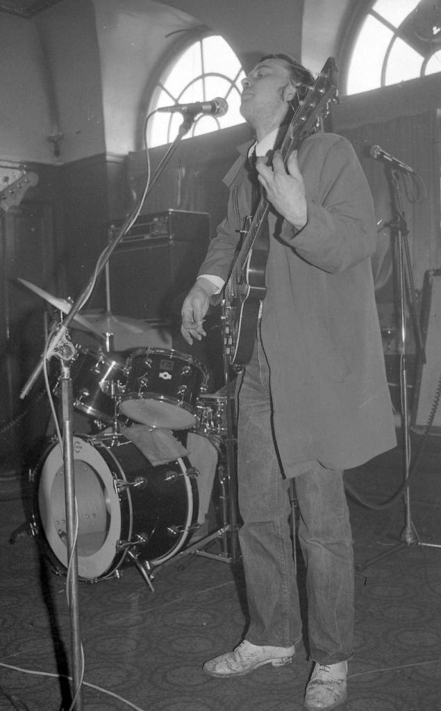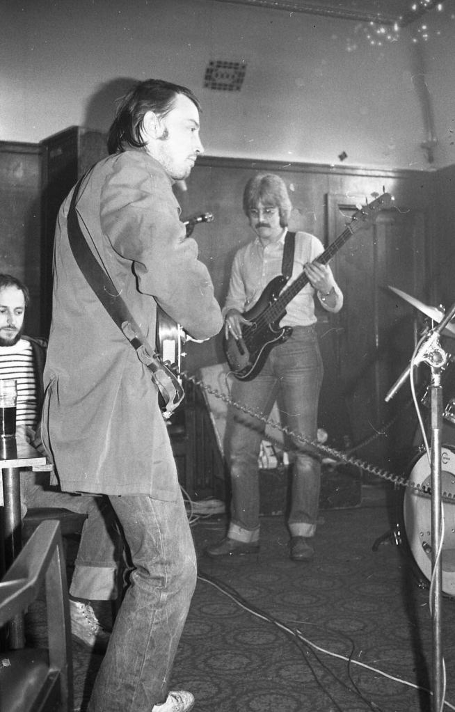 The Volunteers’ Rob Jacobs, with Justin Hildreth (who was moonlighting from Roogalator) on drums behind, at The Woodenbridge, Guildford c’78. Picture courtesy of Fred Pipes