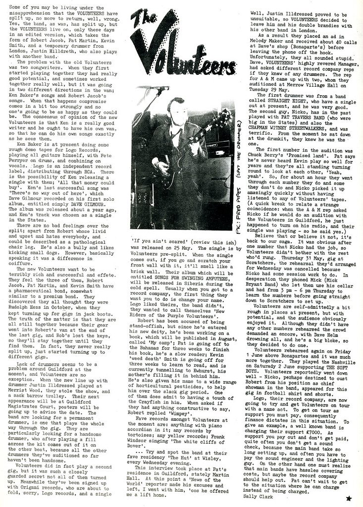 Rob Jacob up front of The Volunteers at The Wooden Bridge, Guildford, late in 1978. Picture courtesy of Fred PipesRob Jacob up front of The Volunteers at The Wooden Bridge, Guildford, late in 1978. Picture courtesy of Fred PipesRob Jacob up front, with Pat Martin behind, of The Volunteers at The Wooden Bridge, Guildford, late in 1978. Picture courtesy of Fred PipesRob Jacob up front, with Pat Martin behind, of The Volunteers – and Frank in the corner – at The Wooden Bridge, Guildford, late in 1978. Picture courtesy of Fred PipesRob Jacob up front of The Volunteers, with Justin Hildreth on drums (moonlighting from Roogalator) at The Wooden Bridge, Guildford, late in 1978. Picture courtesy of Fred PipesRob Jacob up front of The Volunteers at The Wooden Bridge, Guildford, late in 1978. Picture courtesy of Fred PipesRob Jacob up front of The Volunteers, with Justin Hildreth on drums (moonlighting from Roogalator) at The Wooden Bridge, Guildford, late in 1978. Picture courtesy of Fred PipesRob Jacob up front, with Pat Martin behind, of The Volunteers – and Frank in the corner – at The Wooden Bridge, Guildford, late in 1978. Picture courtesy of Fred PipesRob Jacob up front of The Volunteers at The Wooden Bridge, Guildford, late in 1978. Picture courtesy of Fred Pipes.The Volunteers at The Woodenbridge, Guildford c’78. Picture courtesy of Fred PipesThe Volunteers at The Woodenbridge, Guildford c’78. Picture courtesy of Fred PipesThe Volunteers at The Woodenbridge, Guildford c’78. Picture courtesy of Fred PipesThe Volunteers’ Rob Jacobs, with Justin Hildreth (who was moonlighting from Roogalator) on drums behind, at The Woodenbridge, Guildford c’78. Picture courtesy of Fred PipesThe Volunteers’ Rob Jacobs, with Justin Hildreth (who was moonlighting from Roogalator) on drums behind, at The Woodenbridge, Guildford c’78. Picture courtesy of Fred PipesThe Volunteers’ Rob Jacobs, with Justin Hildreth (who was moonlighting from Roogalator) on drums behind, at The Woodenbridge, Guildford c’78. Picture courtesy of Fred PipesArticle on The Volunteers from page 10 of the Barbed Wire fanzine issued in January 1979. Picture courtesy of Fred PipesGig Review from Barbed Wire Vol 2 No.2, May 1979. Picture courtesy of Fred PipesThe Volunteers interview with Sally Clark for Barbed Wire in 1979 Volume 2 Number 3. Picture courtesy of Fred Pipes
