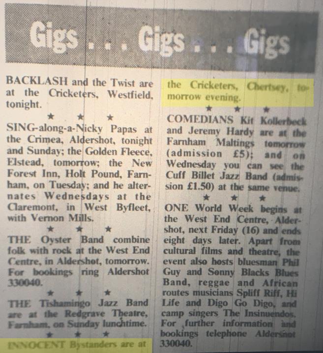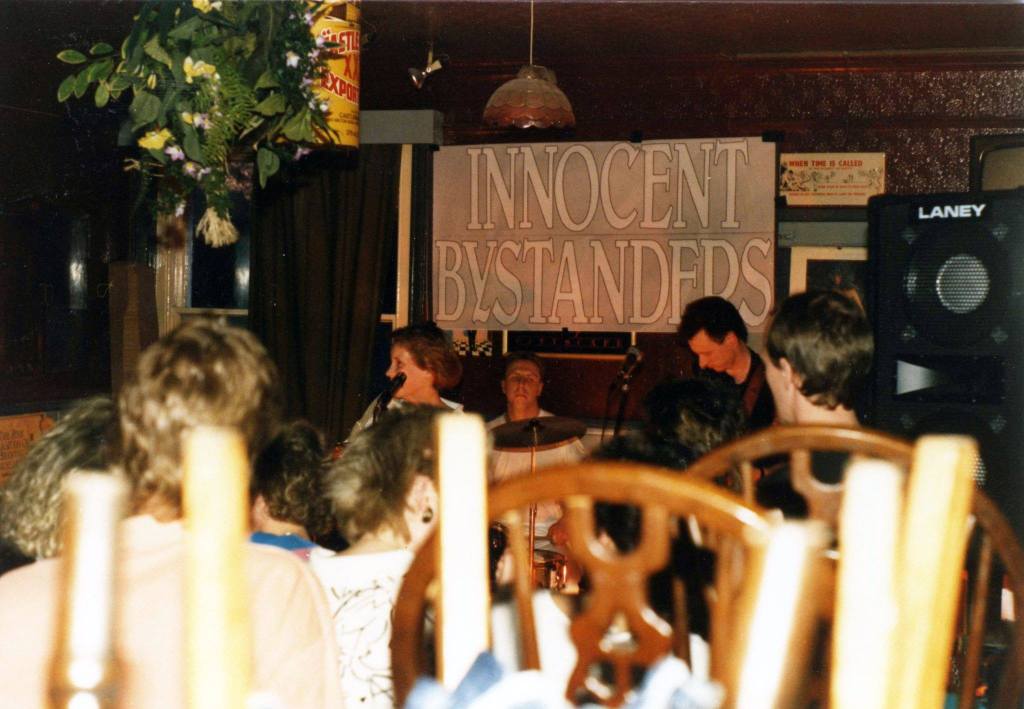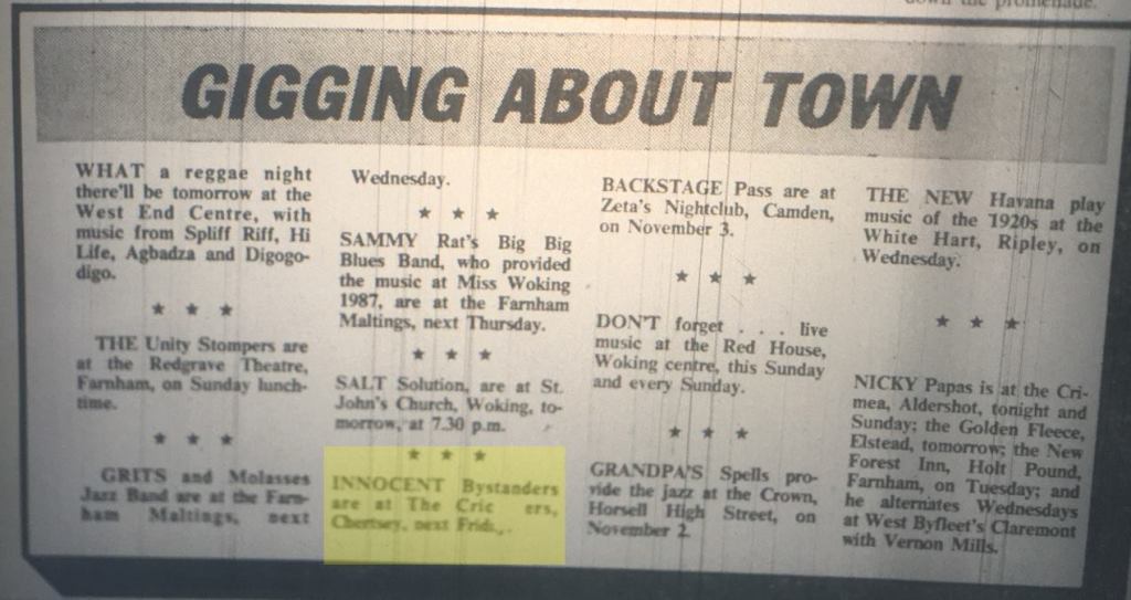 The Innocent Bystanders spent some time at RAM Studios, Hayes in the Summer ’86. This Guildford band also had a regular gig at The Talbot Hotel, Ripley. This ended in ’87 when The Talbot stopped doing gigs with the band securing two or three gigs at The Duke Of Wellington, Farncombe after persuading the landlord at short notice. In October ’87 the band played two gigs at The Cricketers, Chertsey; on Friday 2nd and 30th. The next month, on 13 November ’87, they performed at Brunel University, Egham