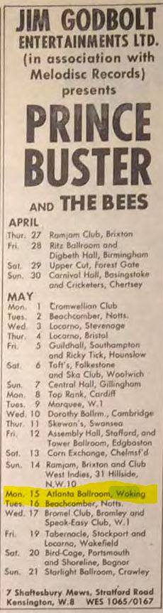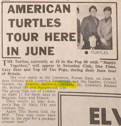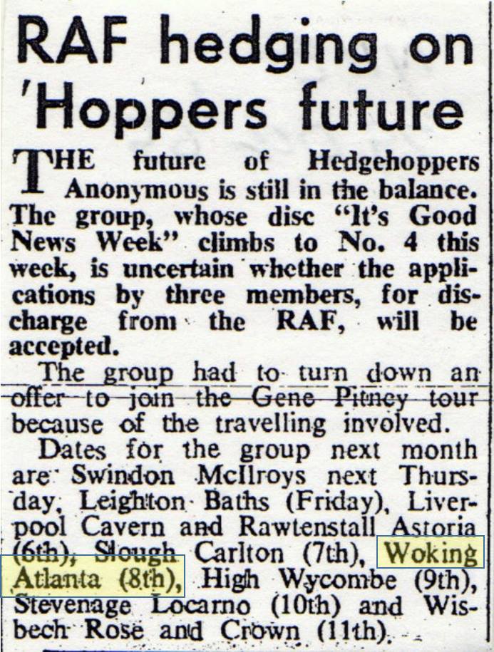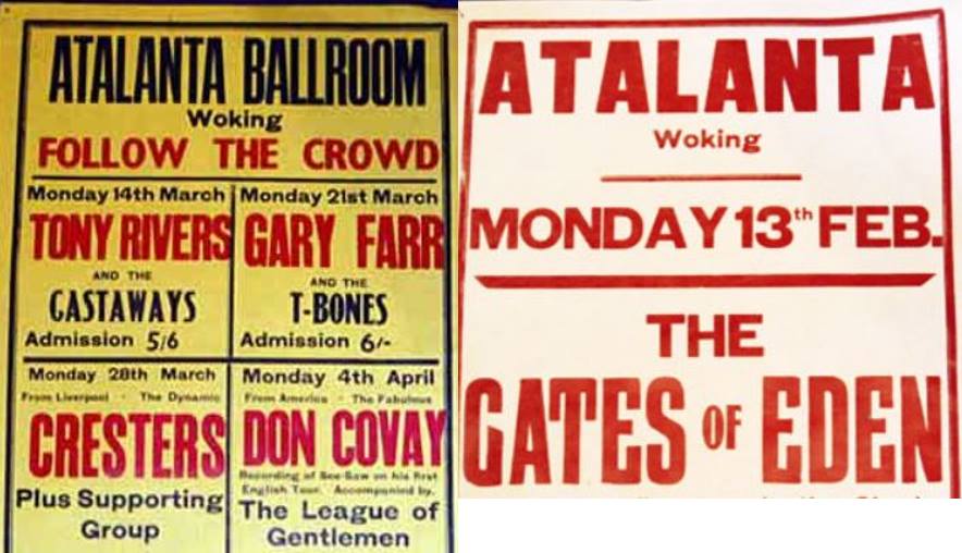 Steam Packet appeared in ’66 – with Rod Stewart on vocals; Acker Bilk (5th Sept ’67), The Turtles, Johnny Kidd and the Pirates, The Who, John Mayall’s Bluesbreakers, Graham Bond Organisation, Screaming Lord Sutch, Geno Washington And The Ram Jam Band, The Temperance Seven, Tornadoes, Wilson Pickett, The Equals (16 July ’68) and many other sixties headliners such as Tom Jones (16 February ’65 – and earlier in ’63 – was paid 100 quid) supported by one of Bob’s bands, Rampant from Portsmouth. The image used on the front cover on Tom Jones and the Squires’ 1965, 7″ 4-track vinyl “Tom Ones On Stage” was taken at The Atalanta, Woking. Of course, the local bands kept the place alive; local bands like The Late.