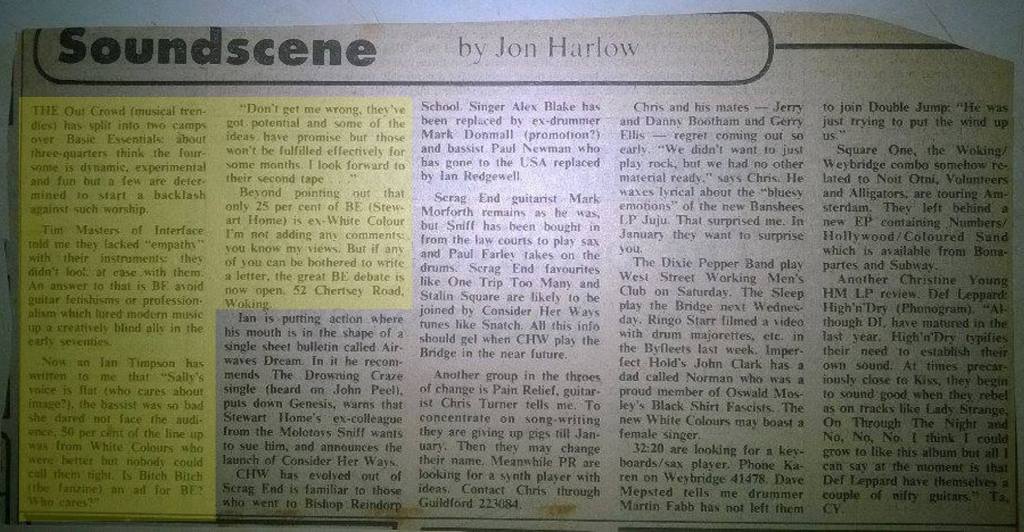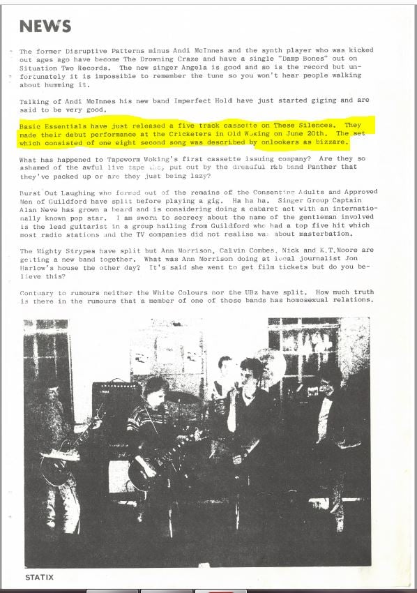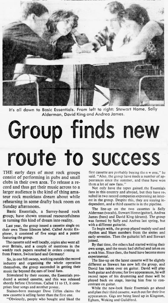 This four-piece were formed by Andrea James and managed by David Tiffen, who also wrote some lyrics. A pre-gigging incarnation included Steve ? (guitar) with King, who was the guitarist with The Sleep. Home was in White Colours prior (with a slight overlap) to Basic Essentials and The Molotovs. King worked as a recording engineer at Theatre Projects in Neal’s Yard, Covent Garden and the band were able to use the place at the weekends to rehearse and record for free. Debuting at The Cricketers, Westfield on 20 June 1980, they played mostly their own material, with the odd cover, which despite the pretty traditional band construct was rather “experimental”. We also know that they appeared at The Star, Guildford.