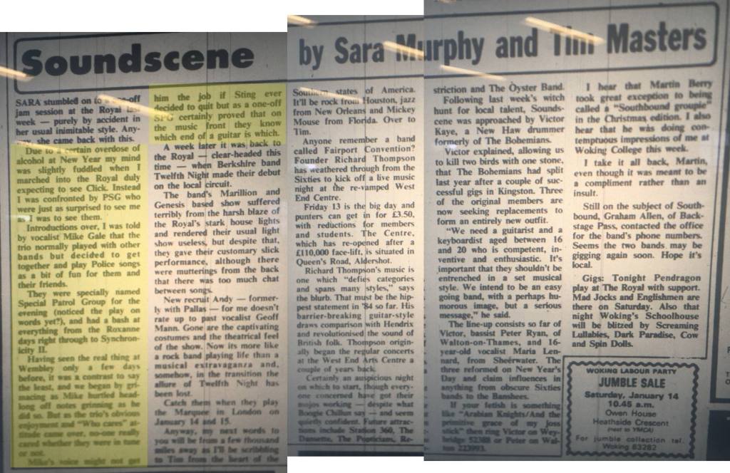 This three-piece supported other bands in the area. In early January ’84 the band appeared at The Royal, Guildford under the pseudonym Special Patrol Group to play Police songs for fun and friends.
