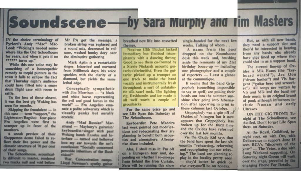 Glib Thicket are known to have gigged at The Target, Reading on 2 January ‘8. They were at the Community Centre, Knaphill supporting Backstage Pass on 23 March ’84, and the very next week, on 30 March, were there again for a solo gig. Later that year the band played The Old Schoolhouse, Woking; with Fra Angelico in support, on 7 June ’84.