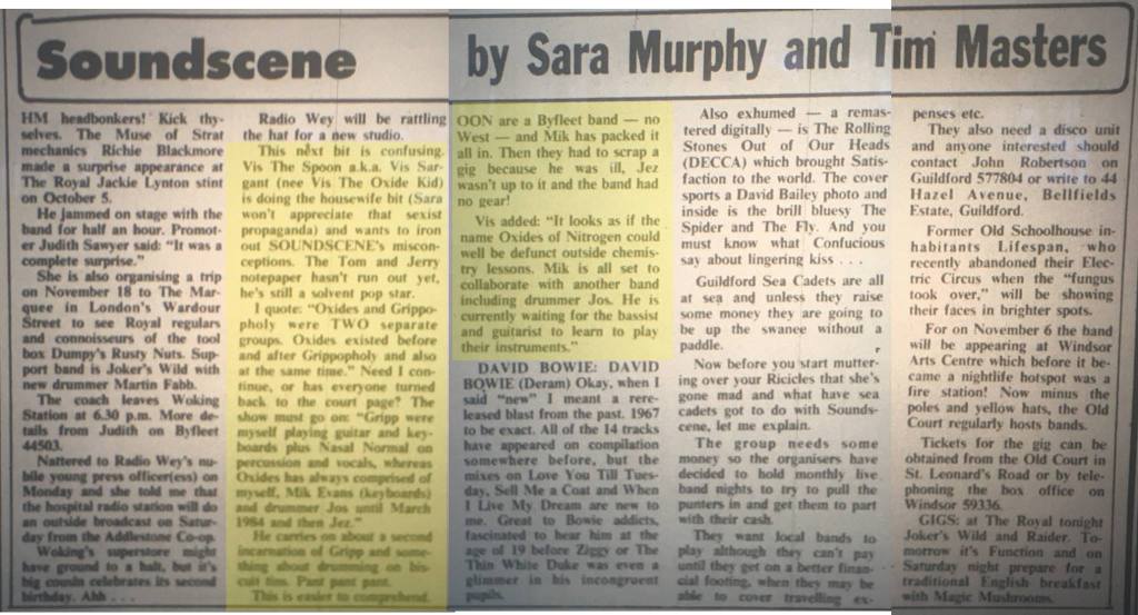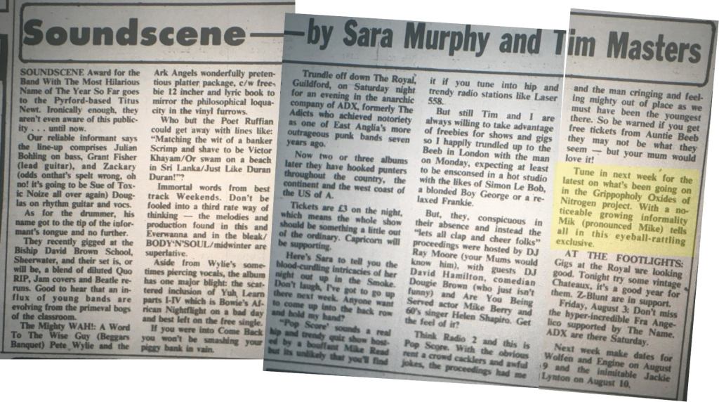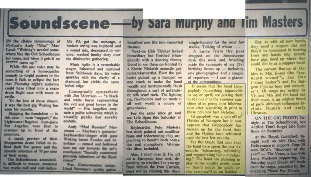 A spin off of Oxides of Nitrogen, Grippopholy split and reformed several times during their short tenure across late ’83 and through ’84. As yet we’ve found no record of the Byfleet based Grippopholy playing a gig.