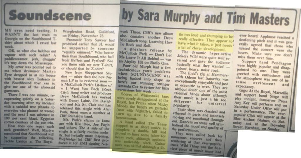 Melodic rockers, The Tease, stepped in at short notice to support Jokers Wild when ex-Whitesnake guitarist Micky Moody’s Nightfly failed to show at The Royal, Guildford on 9 November ’84, due to a family bereavement. The following year The Tease are known to have played the Church Hall, Walton on 8 April and the Blue Anchor, Staines on 10 May.