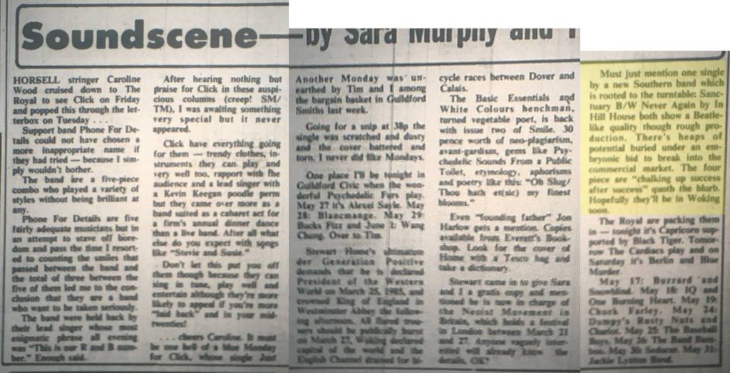 This Reading based band released the ‘Sanctuary’ single (IHH001) in April ’84 on their own label, via Oxford based agency Seyscan, where they were managed by Colin Badger and Nigel Grant. This was recorded Blackwing Studios, London and engineered by John Fryer; as was the b-side track “Never Again”. According the response to an interview question posed by Roque of Cloudberry Cake Proselytism v.3 to Cutmore: “Sanctuary was inspired by the story of The Hunchback of Notre Dame, combined with how I felt living in eighties UK in the age of greed and the rule of Thatcher,…and a spiritual aspect of myself”
