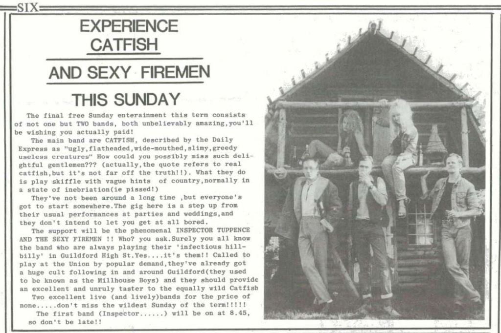 On 8 December ’85: Inspector Tuppence and the Sexy Firemen supported Catfish at University of Surrey, Guildford, and an early Buzz Club saw then booked to support Terry & Gerry, a gig held at The Princes Hall, Aldershot on 16 February ’86, instead of the West End Centre, Aldershot as heavy snow on the roof of the West End Centre deemed the club’s regular venue unsafe. The are known to have also appeared at Guildford hostelries: The Royal, The Drummond Arms, The Cannon, Pews Wine Bar and The Plough.