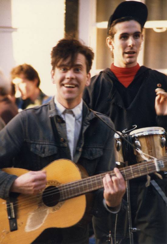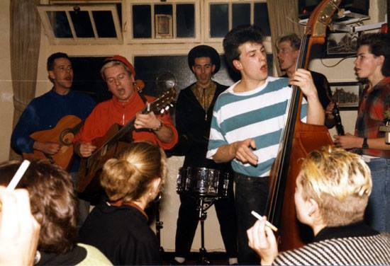 Around ’89 the whole band were living in a squat in Chalk Farm, North London and did most of their busking in Leicester Square; adding Jay Wallis (trumpet) – possibly as a result of an ad in 2 May ’91 issue of The Stage (Ed – Still trying to obtain an image) – and Jim ‘Wazza’ Shearman (drums) to the band.
