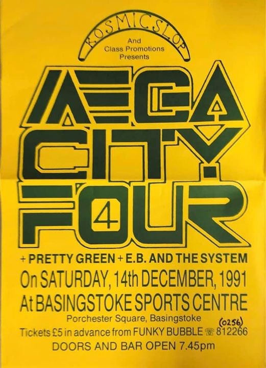 From late in ’91, Fleet based, Pretty Green gigged up to two or three times a week. Along with E.B. and The System the band opened for Mega City Four at Basingstoke Sports Centre on 4 December ’91.
