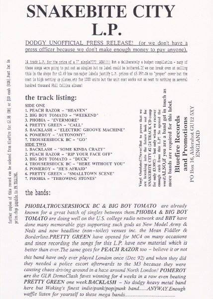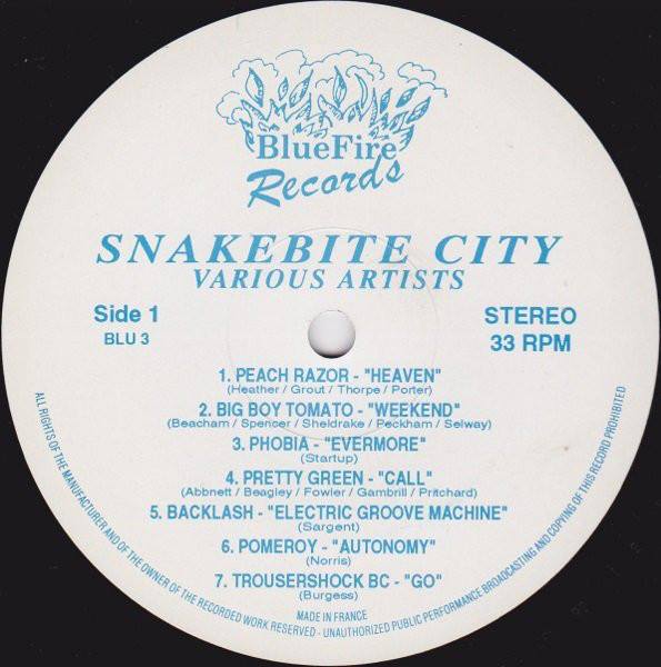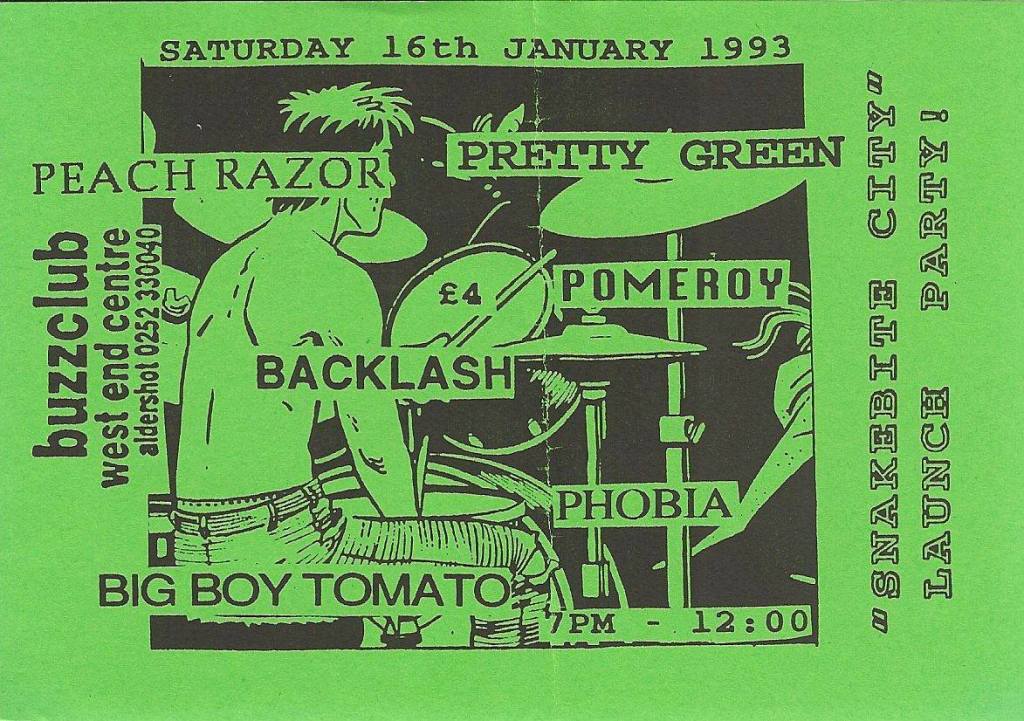 The band kicked off ’93 with an appearance at The Buzz Club, West End Centre, Aldershot on 16 January with Preachrazer, Pomeroy, Phobia and Backlash for the Snakebite City Launch organized by Paul Talling. The Cricketers, Westfield hosted the post-punk indie rock n’ roll triumvirate of Backlash, with Pretty Green and Peachrazor in support on 19 March ’93. They then returned to The Buzz Club for another local bands night on 3 April ’93, this time with Flowers of Sacrifice, Peachrazor and Backlash. Later that year “Small Town Scene” was published again, this time on Return of Farnborough Groove Vol.3. Bluefire Records got then back in ’94 for Snakebite City Two with “The Wrong Conclusion”.