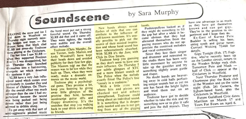 This four piece took their name from The Stranglers song ‘Goodbye Toulouse’ and did a cover of ‘Prince of the Streets’, as well as showing influence from XTC and The Police. The band put out a demo cassette carrying “Small Town” and “Casualty”. The band played The Cricketers, Westfield on 18 November or 12 December ’82 supported by XLR8. They returned to the venue on 10 February ’83, again with XLR8 in support.