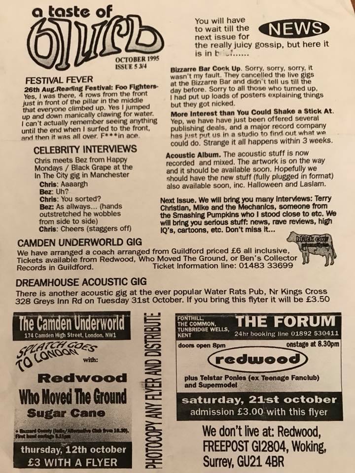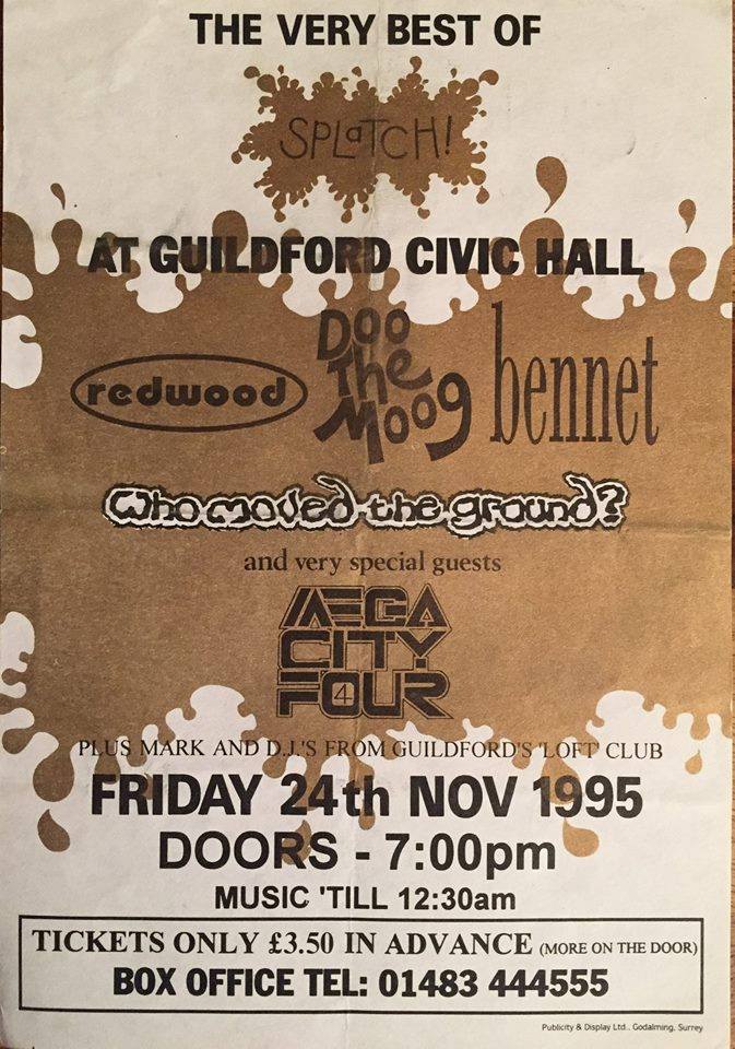 In ’95 they started a three year run at the Phoenix Festival, with interest shown by major labels including Polydor and EMI. The free studio time that came with this interest developed into ’95’s release: “Asylum”. Airplay was received from Radio 1 and two appearances on cable TV followed; Melody Maker even gave away tickets for one of their gigs. Redwood play Splatch! at Civic Hall, Guildford on the 16 July ’95 with Headnoise, Supermodel and Disturbing Guests. On 8 August ’95 the band supported Dreamhouse and Dominic Miller, along with Margo Buchanan and John Wiffin, at Splash Club at The Water Rats, Kings Cross. ‘Splatch! Goes to London’ presented Redwood, Who Moved the Ground? and Sugar Cane at The Underworld, Camden on 12 October ’95. Towards the end of ’95 and into ’96 the band started playing more and more acoustic gigs. Local promoter Barney Jeavons had Redwood at the Civic Hall, Guildford for Splatch! on 24 November ’95 which also saw Mega City Four, Doo the Moog, Bennet, and Who Moved the Ground? take to the stage.