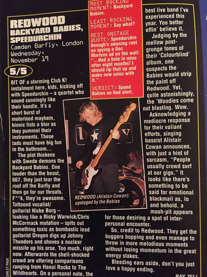 In May ’97 they shared the Civic Hall, Guildford stage with Supermodel, Jolt and Inter for another Splatch! night. On 1 May they played the first of 4 in-stores at HMV, Guildford for the release of ‘Gone’ from the forthcoming album “Colourblind”, and were back at HMV on the 27 June. On 12 July ’97, Redwood played the Ambient Green Picnic, Millmead Island, Guildford. The next month (11 August), presaging the release of their album Redwood played their 3rd in-store at HMV Guildford to promote the new single ‘Claustrophobe’.