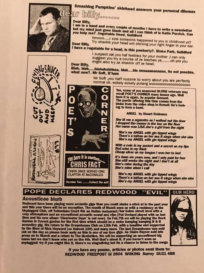 After a period of stability the band was shaken down to just the Cowan brothers, probably due to a move to Woking, who won the Annual Band Competition at Guildford Uni (need to check if Guildford Tech or Surrey University). The University of Surrey’s Fun Fest ’91 had the band joining The Flowerpot Men, The Ha Ha Men, Railroad Earth, and Trousershock BC for an outdoor concert at Surrey Court student residence on 22 June. James Walker joined on drums for a year and played on the “Mary Jane” cassette EP, released in ’93. That same year they appeared at Rock Explosion 2 at the Civic Hall, Guildford. The band began to gig throughout the South East and started a newsletter titled ‘blurb’. On Walker’s departure Hughes took the sticks.