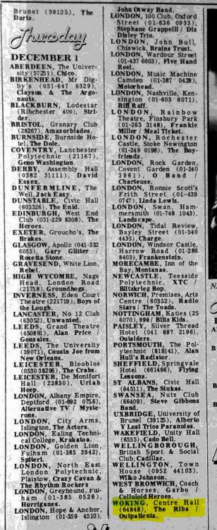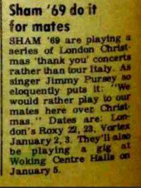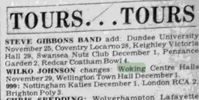 By late ’77, early ’78, the Centre Hall was becoming a bit of a regular venue, thanks in part to Joy ? who booked ‘not so mainstream’ bands for the Centre Halls. Those bands included the likes of: The Stranglers (9 Feb ’77), and The Crabs (24 Sept ’77 & 20 May ’78). Wilko Johnson made Woking’s Centre Halls a late addition to his tour, appearing at the venue on 29 November ’77. Sham 69 opened ’78 with a gig at the venue on 5 January; a gig that ran so late the last train to Guildford was missed by several gig-goers who walked home with snow on the ground.