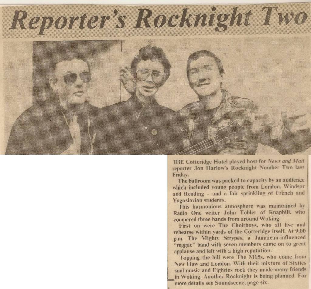 This Woking band opened for, News & Mail reporter, John Harlow’s Rock Night II, supporting The Mighty Strypes and M.I.5. at The Cotteridge Hotel, Woking; an event compered by Radio One writer John Tobler.