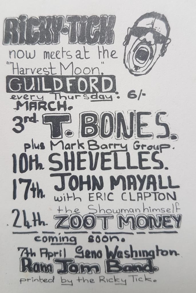 On 3 March ’66, T. Bones along with the Mark Barry Group performed at the new Ricky Tick venue, upstairs at The Harvest Moon. The following week, on 10 March, Welsh beat pop group The Shevelles were back; with John Mayall’s Blues Breakers featuring Eric Clapton on 17 March. Soho scene-sters, Zoot Money appeared on the 24 March and Geno Washington and the Ram Jam Band on 7 April.’ But after a couple of months it was time to move again.