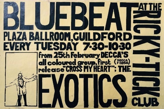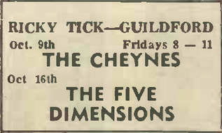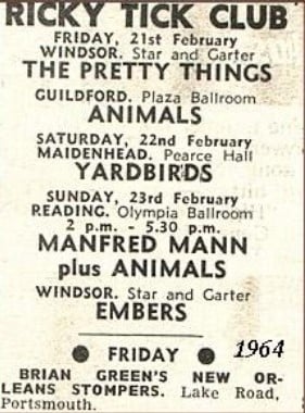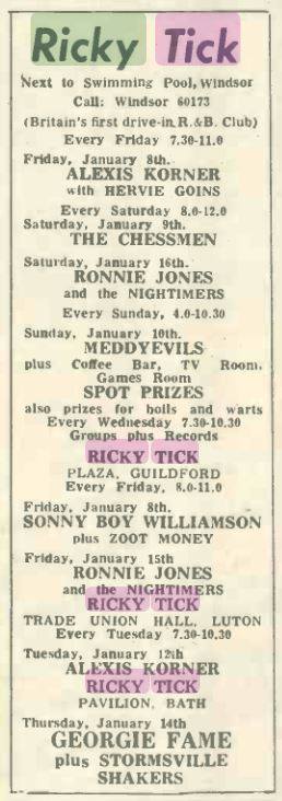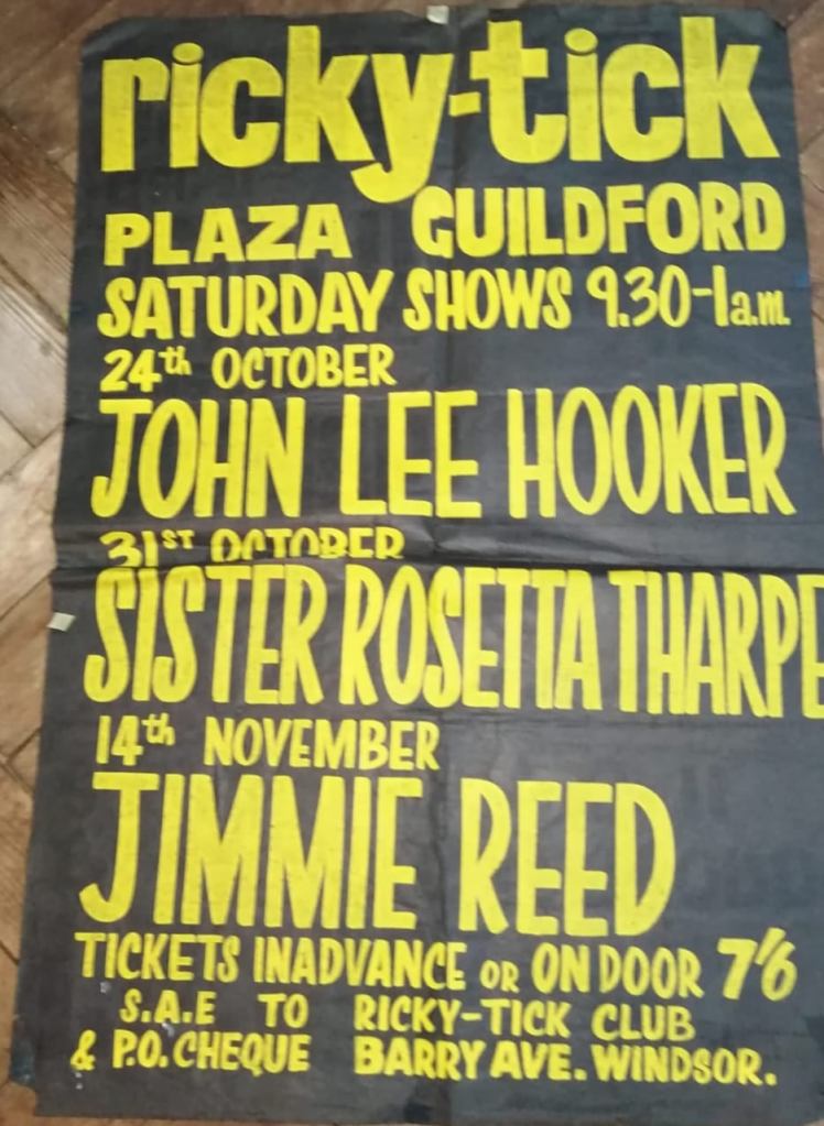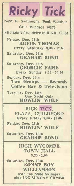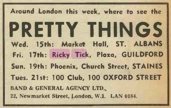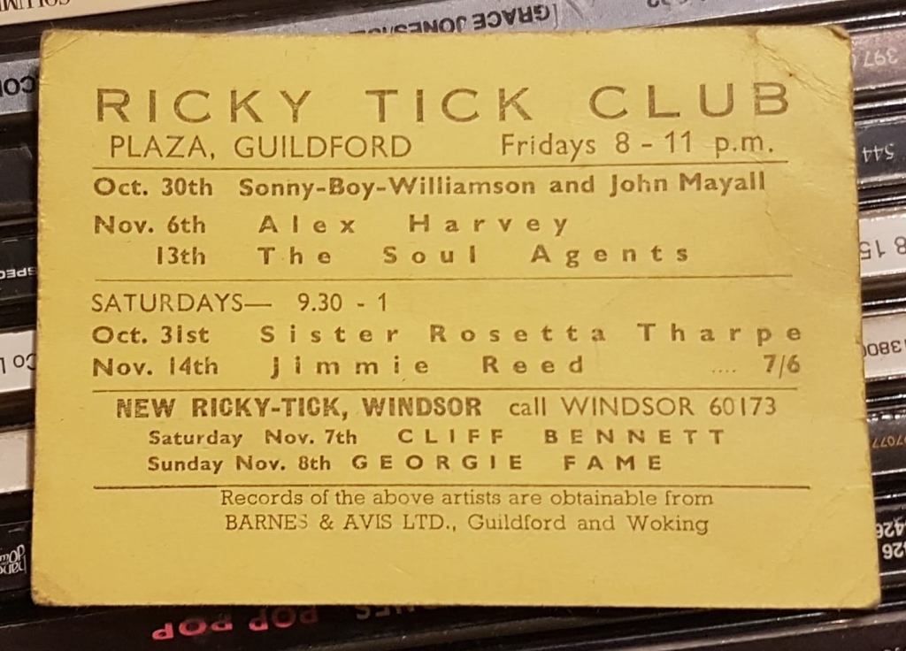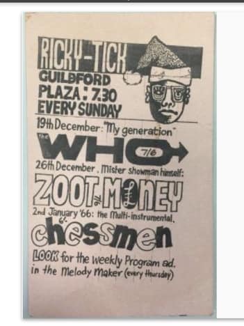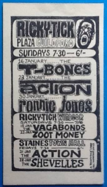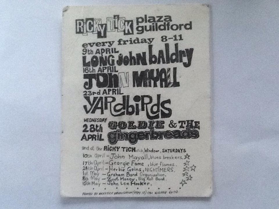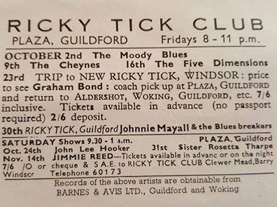 (c’62-66) After seeing how well the Ealing Club worked in early ’62, John Mansfield and Philip Hayward established The Ricky-Tick in Windsor, becoming an influential 60’s R&B venue, hosting the likes of The Rolling Stones, The Who, Jimi Hendrix, Pink Floyd and Cream. The Ricky Tick was so successful that the enterprising duo established and promoted Ricky Tick clubs in 27 towns including Guildford, which was their second and the most regular club after Windsor. The Guildford Ricky Tick hired The Wooden Bridge, the Civic Hall, Guildford and Memorial Hall, Worplesdon before settling into The Plaza, Guildford. Five bob would get you in to see the likes of The Yardbirds, John Lee Hooker, Howlin’ Wolf, Charlie & Inez Foxx, Graham Bond, Zoot Money, Chris Farlowe, Georgie Fame, and John Mayall on a Friday night.