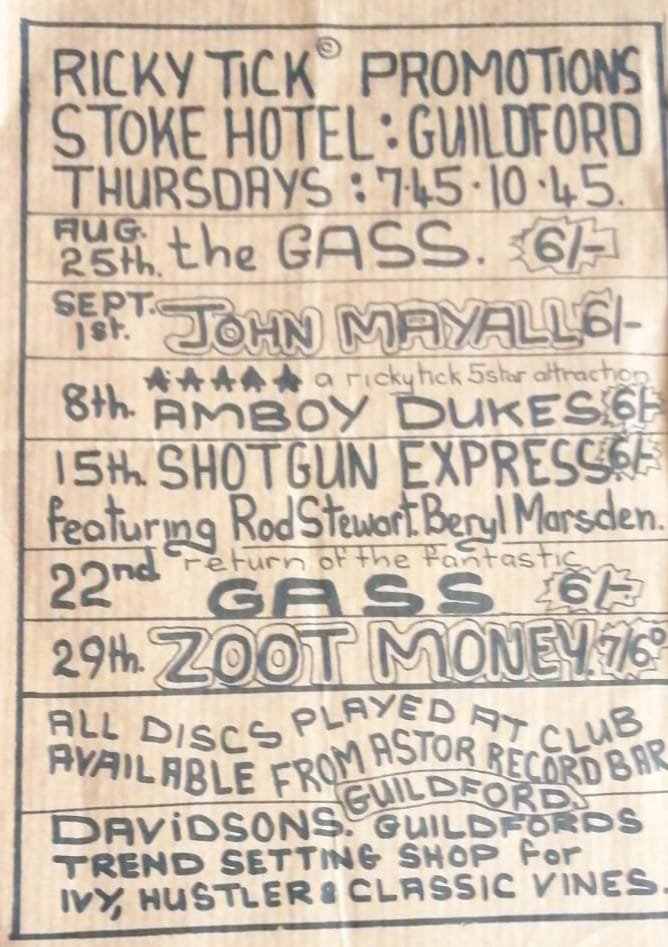 The Stoke Hotel, Guildford, affectionately called Stoke Hole, served the Ricky Tick well for its final four months. On 4 August ’66, Zoot Money was back. Elevated from support to headline the Mark Barry Group performed on 11 August. Geno Washington and the Ram Jam Band had just released the ‘Hi, Hi, Hazel’ single on Piccadilly when they performed on 18 August. On 25 August ’66 it hosted The Gass, the following Thursday, 1 September, John Mayall took to the ‘stage’ followed by Amboy Dukes the next week. Rod Stewart and Beryl Marsden were featured with Shotgun Express on 15 September followed by The Gass’ monthly visit on 22 September and Zoot Money on 29 September. The Ricky Tick’s last Guildford event was in October ‘66 at Stoke Hole, but we’ve yet to confirm who appeared.