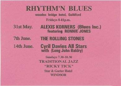 The Guildford Ricky Tick’s opening night was 9 March ’63 at The Wooden Bridge, Guildford and featured The Rolling Stones, who were making their first appearance in Guildford. Hundreds of fans had assembled, with many of the unticketed unable to get in. Doors and windows were shut and locked to bar the rabble from entry, but once The Stones began to play the fire doors burst open and the crowd poured in. The Wooden Bridge was more subdued, but still packed, on 31 May ’63 for Alexis Korners Blues Inc., with The Rolling Stones returning a week later on 7 June, the second of seven gigs Mansfield and Hayward had book the band to perform at Ricky Tick, Guildford. A similar booking arrangement had been set with the Cyril Davies All Stars with Long John Baldry who reappeared on 14 June and again on 5 July. A recently formed four piece jazz/rhythm and blues group called The Graham Bond Organization, consisting of Graham Bond, Jack Bruce, Ginger Baker and John McLaughlin, took to The Wooden Bridge’s low stage on 12 July; and The Rolling Stones returned the week after on 19 July.