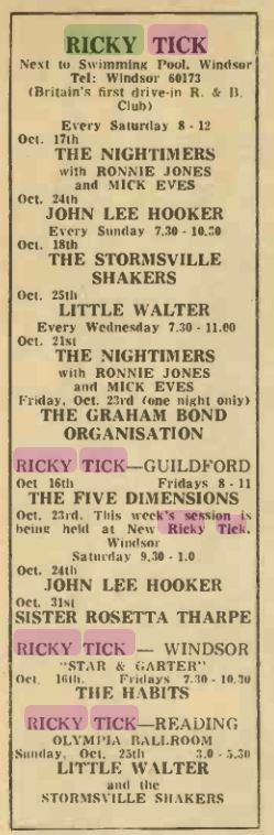 On 6 September ’63, John Mayall’s Blues Breakers were back, a month after their first appearance, and again on 20 September ’63. Sandwiched in-between these two date was Jimmy Powell & The Dimensions, probably with Rod Stewart, on 13 September ’63. The first concert in October featured the Cyril Davies All-stars with Long John Baldry on 4 October ’63 and the next week on 11 October, it was Jimmy Powell & The Dimensions once again, while local band Hogsnort Rupert’s Soul Builders with Mel Turner took to the stage the week after that, the 18 October ’63. Jumping to November ’63, Cyril Davies All-Stars and Long John Baldry were back again on 2 November followed by the last Rick Tick at the hall which featured The Stormsville Shakers on 15 November ’63.
