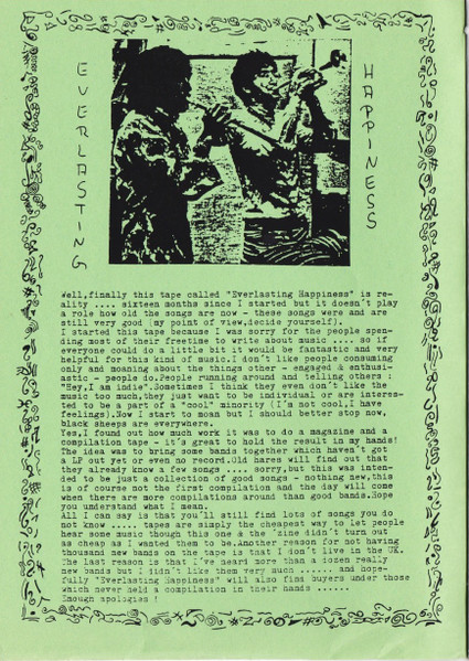 A local band night at the Buzz Club saw The Vinegar Blossom take to the stage with Slug, Phobia, The Rachel Papers and Flavour on 4 January ’92. Then on 28 March ’92 the band entered the Echoey Groove Studio at Bracknell Arts Centre and recorded a live demo which included “Don’t Go Raising Your Spirits Around Here”. It’s unclear if this was before or after the Andreas Hering compiled the “Everlasting Happiness” compilation cassette that included the band’s “Solstice”. After spending 16 months compiling the cassette, Hering released it in Germany sometime in ’92.