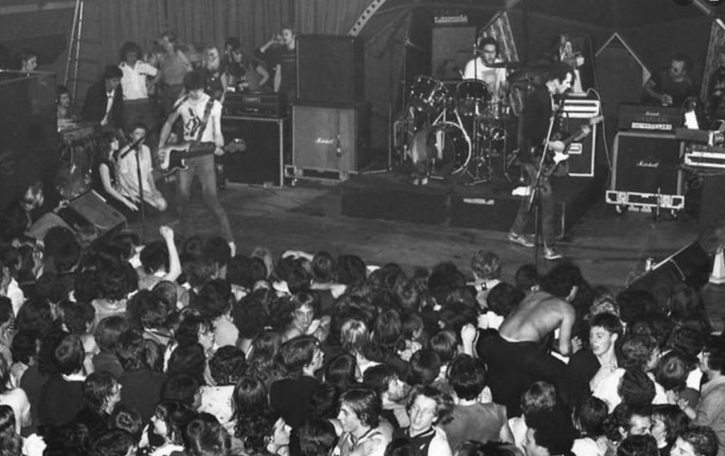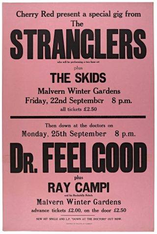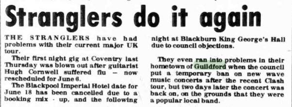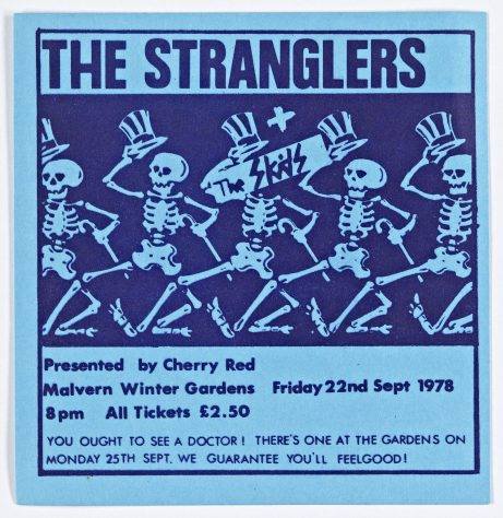 In February 1978 the Stranglers began a mini-tour, playing three secret pub gigs at the venues that supported them in the early days: The Duke of Lancaster, New Barnet; The Red Cow, Hammersmith; and The Nashville Rooms, West Kensington. They also return to the Civic Hall, Guildford, this time there was a heavy police presence and steel toe-capped boots, belts and anything dangerous looking was confiscated at the door. The band graced Brighton, Glasgow, Edinburgh, Stafford, Leeds, and London with their tour from late May to early June ’78. Over the coming years along with great gigs and music they brought strippers onstage at their open-air Battersea Park gig in September 1978; tied a female NME journalist up and left her in a Portuguese desert after a particularly vitriolic review in September ’79. On 7 October ’79 they appeared at the Apollo, Glasgow followed, on 14 October, by a gig at Top Rank, Sheffield. That same year they bound French TV journalist Antoine De Caunes halfway up the Eiffel Tower.