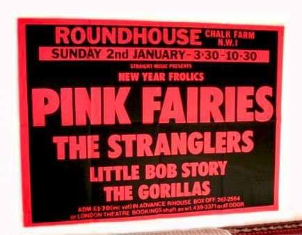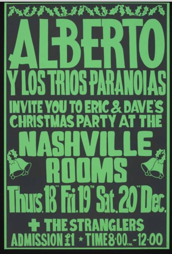 The band rehearsed at Bramley Village Hall, Shalford Scout Hut and Brook cricket pavilion. It was at one of these that three schoolgirls left a note for them, reading: “To the group in the shed. We like your music and you. Why not go professional? You’re good enough.” In the Spring of that year, about the time the “The Stranglers are coming – they’re Strangtastic” graffiti appeared in the subway by the railway station and on a number of hoardings in the centre of Guildford, they recorded a demo of “Bitching” at Foel Studio, Llanfair Caereinion, Powys with Ian Gomm producing. Eric & Dave’s Christmas Party at The Nashville was held on the 18, 19 and 20 December ’75 with Albert Y Los Trios Paranoias supported by The Stranglers. A short-term recording deal with Safari Records scheduled the release The Stranglers first single in ’75, however Safari Records reneged on the deal to release “My Young Dreams” through a lack of cash. The track was finally released in ’82 by EMI to fulfill a contract. Strapped for cash Cornwell took a temporary job as a teacher, Burnel gave private French lessons, and Greenfield and Black became piano tuners/repairers.