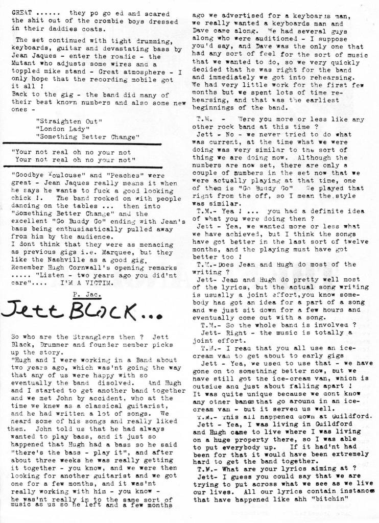 In January ’77, The Stranglers were featured in T. Moon’s Sideburns fanzine No.1, and Fox Leisure booked the band to play the Red Deer Croydon on 20 January, and the Toby Jug, Tolworth on 24 January ’77. They closed out the month supporting Climax Bles Band at the Rainbow Thearte, London on 30 January ’77. The next month, on 9 February, they played the Centre Halls, Woking. The band also appeared at the Rider Open Air Festival, Scheeßel, Germany on the 3 or 4 September ’77, along with two other local talents, namely Camel and Graham Parker, back by The Rumour. Prior to the release of “No More Heroes” on 23 September ’77; they released their third single, “Something Better Change” which was taken from the album. It made No.9 in the UK Singles Chart. It was also double A-sided with the song “Straighten Out”, a non-album track. Locally, the bands reception in Chiddingfold and Guildford could be best described as chilly. Guildford council had banned them from playing at the Civic Hall, even when they were No.1 in the album charts. According to Steve Baker, Hugh Cornwell said “we spent 2 hours moving all the chairs off the dance floor and someone has put them back, please be good boys and girls and put the chairs neatly against the walls please”. Two minutes later there was a pile of 400 broken chairs in the middle of the dance floor. Not really a riot, just people wanting to dance to the music. The London Borough Council also took issue with the band, banning them for wearing t-shirts emblazoned with “Fuck” in the form of the Ford logo at The Rainbow Theatre. In November ’77 there were more ‘issues’. On 12 November ’77 the band were to play at The Tivoli Theatre, Dublin. But they didn’t show, with the audience only seeing the support acts, The Radio Stars and The Vipers and a goodly dose of fighting. The previous night at Trinity College, Dublin was marred by violence and lots of gobbing, with the band deciding to give the Tivoli a miss – Not that those at Tivoli got an explanation at the time.