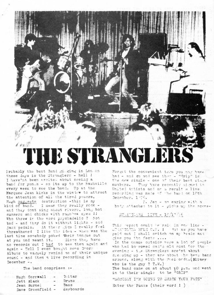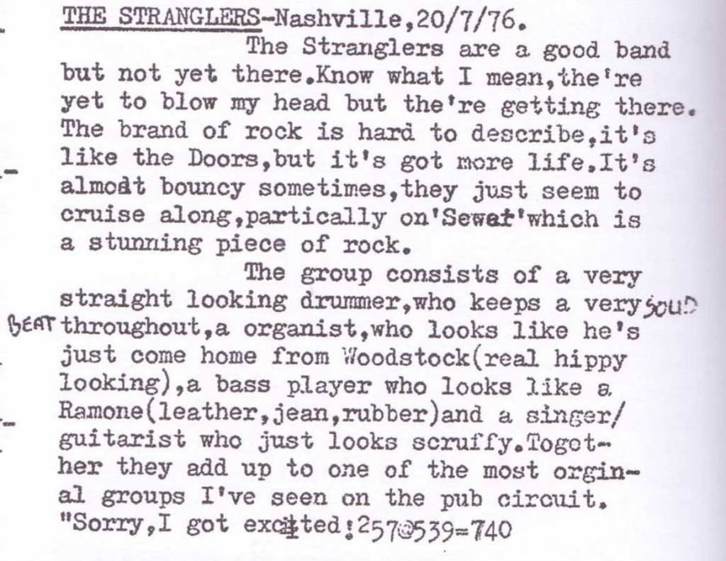 In May ’76, The Stranglers opened for Patti Smith’s first UK appearances, playing The Roundhouse, London for two nights – 16 and 17 May – as part of the ‘Horses Tour’. Two months later, on 4 July, The Stranglers opened for the first British appearance of American punks The Ramones, also at The Roundhouse, a gig that was headlined by The Flamin’ Groovies; repeating the show the next night at Dingwalls, Camden. 1976 was spent playing about 350 gigs; including a week long residency at the Hope & Anchor, Islington on 13-17 July and a home turf appearance at ‘Rock At The Royal’ organized by Ray “Bonza” Bradman at The Royal, Guildford on 1 August 1976. Here they were billed as Punk Rock, but as any follower of the band will know this ‘Punk’ moniker is highly debated. NME’s Chas de Whalley referred to them having ‘all the punk poise of the Electric Prunes.’ in early ’76, while The News of the World, in April, named Cornwell as ‘the guru of punk’…the debate: Punk, New Wave or Pub Rock? goes on