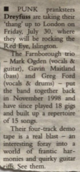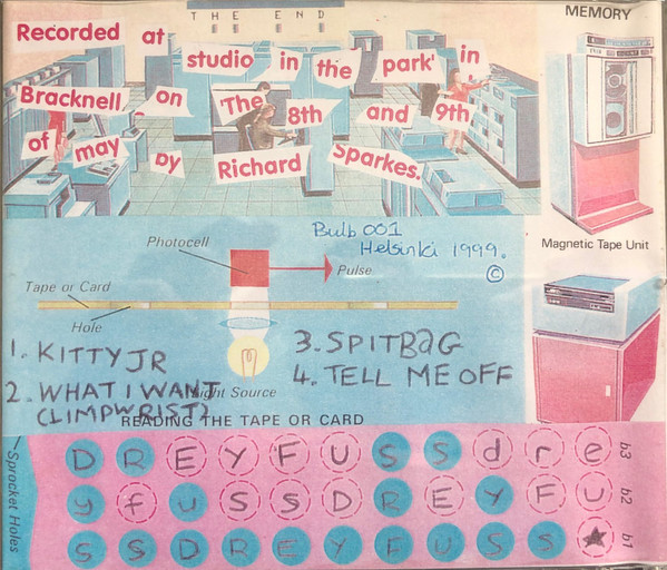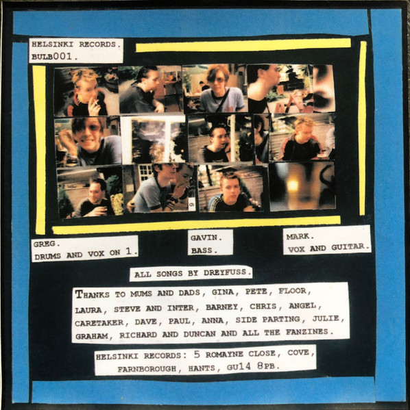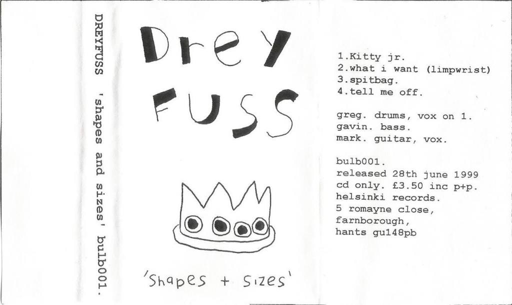 This Cove / Farnborough band formed in November ’98, releasing their “Shapes and Sizes” demo cassette and CDr [bulb001] on Helsinki Records on 28 June ’99; which carried “Kitty Jr”, “What I Want”, “Spitbug”, and “Tell Me Off”. It was the bands first recording and took place at Studio in the Park at the Bracknell Arts Centre, across the 8 and 9 May ’99 with Richard Sparkes at the desk; the result of winning a Battle of the Bands at the Tumbledown Dick, Farnborough. On 30 July ’99 they played their first gig in London at The Red Eye, Islington.