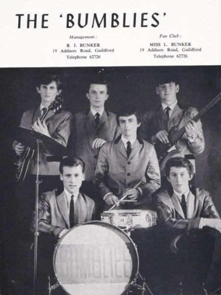 The band used to rehearse in Cranleigh, where, for weeks, Kenneth King, aka Jonathan King, would turn up, saying he would be their singer…he was initially turned down. Managed by Bruce J. Bunker out of 19 Addison Road, Guildford, the band played throughout Surrey and Hampshire; and up into London at The 2 I’s, Soho and the The Jazz Cellar, Kingston, amongst other venues. Bob Potter booked the band, although their name was misspelled as Bumbleies, to support The Mark Leeman Five at Agincourt, Camberley on 14 December ’63, a gig that was moved to the Drill Hall, Camberley. Bunker’s younger sister, Lesley, was the bands fan club secretary, which was also run out of 19 Addison Road.