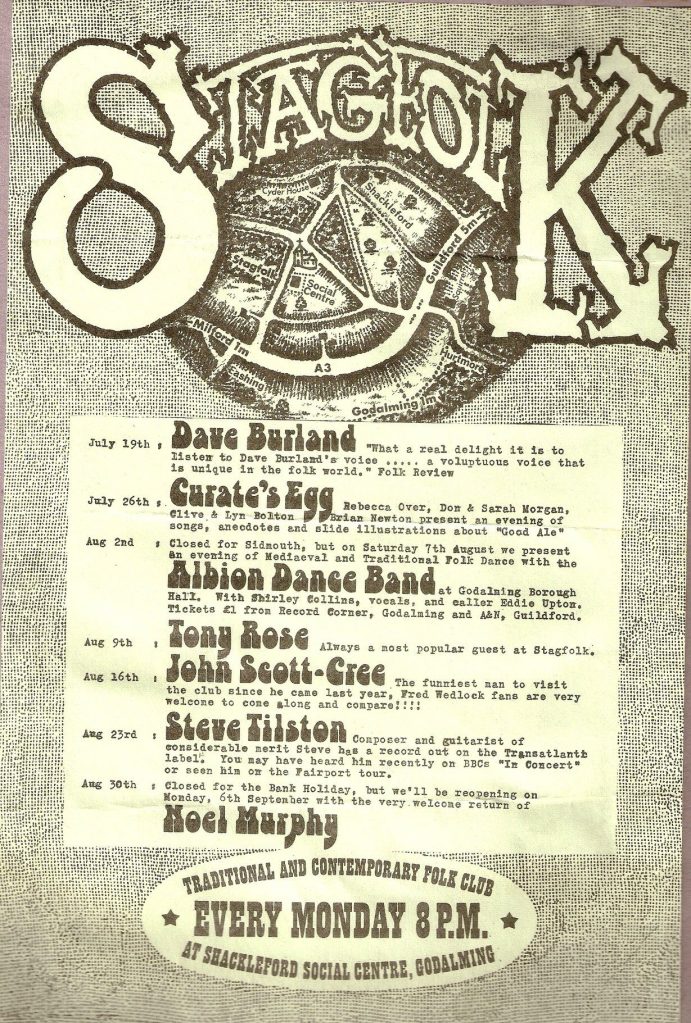 On 9 December ’72 the club held the StagFolk Charity Concert at the Wilfrid Noyce Centre, Godalming and two days later, the English folk-rock band, Hunter Muskett played the club’s home venue. Vin Garbutt used his appearance at the club on 14 January ’74 to record tracks for his “The Young Tin Whistle Pest” album. In ’76 the club began holding barn dances at the Borough Hall, Godalming and initiated the Fleur de Lys Women’s Morris Dancers, who are still around. Dave Burland performed on 19 July ’76, with Curate’s Egg presenting an evening of songs, anecdotes and illustrations on the topic of ‘Good Ale’ the following week – 26 July. Although originally scheduled for 2 August. on 7 August ’76, the StagFolk presented an evening of English folk dance with ex-Fairport Convention / Steeleye Span bassist Ashley Hutchings led The Albion Dance Band at the Borough Hall. The band has rotated through a dizzying number English folk-rock luminaries – On this night Shirley Collins, Hutchings then wife, carried the vocals; along with Mike Gregory who handled percussion, Fairport Convention guitarist Simon Nicol, John Rodd on concertina, and Roger Soscott, and Eddie Upton calling.