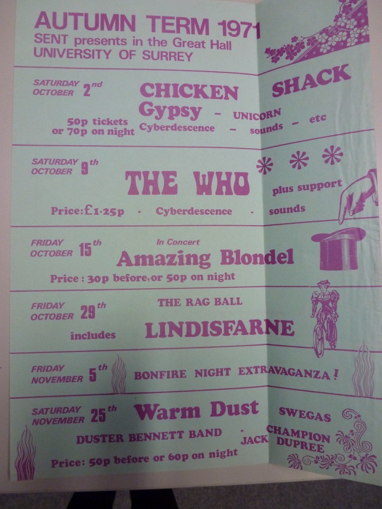 Jumping into 1971 and the University of Surrey hosted Colosseum on 13 February and Trees on 27 February. During the week long 1971 Guildford Festival, the Staff Bar was the venue for Howard Riley on 8 March; Lecture Theatre D hosted the Westminster Trio and Jasper Carrott performed in the Student Bar on 10 March; and on 12 March, University Hall saw High Tide and university band Cage support Osibisa. The poster for the 1971 Autumn term entertainments at the University of Surrey, puts Chicken Shack supported by Gypsy and Unicorn at the venue on 2 October. A week later The Who took to the stage, with Mick Greenwood, who also supported the Amazing Blondel on 15 October. The Rag Ball in 1971 was on 29 October and included Lindesfarne. The following month the SENT crew booked Stoneground to perform on 11 November and local blues-man Duster Bennett, listed as The Duster Bennett Band, to support Warm Dust, along with Swegas and Champion Jack Dupree on Saturday, 25 November ’71 in the Great Hall; however, that was a Thursday and other listings have Warm Dust and Brian Auger’s Oblivion Express playing there on the 27 November, without any mention of Duster. The 4-piece folk group, Purple Banana, started out at a Christmas party at the University with two female vocalists as the Keith Spillet Ensemble.