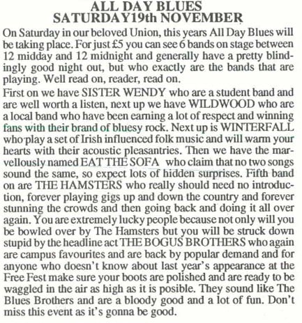 Bare Facts (Issue No.826, 18 Nov 1994) on the All Day Blues event held on 19 November 1994 featuring Sister Wendy, Wildwood, Winterfall, Eat The Sofa, The Hamsters and The Bogus Brothers.