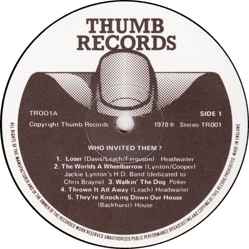 (c’78-’83) Thumb was a small independent label based out of 83 Waltham Avenue, Guildford and owned by Tony Leach, who was in Headwaiter. Their LPs and singles shared the same TR-000 numerical series.