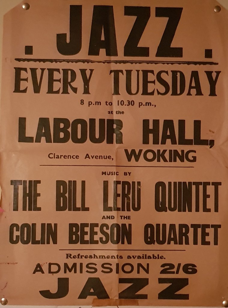 Cauldwell recalls BLQ being the warm up band for Tubby Hayes in Farnborough (possibly Farnborough Tech), but not in Woking. Apparently Tubby was getting rather drunk back stage, with a bottle in hand, and there was concern about how he’d manage the gig; but when he got on stage he played like a god. In the late 50’s/early 60’s, Tuesday was Jazz night at the Labour Hall, on Clarence Avenue, Woking and this featured The Bill Leru Quintet supported by the Colin Beeson Quartet.