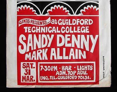 Stone the Crows (a few months before Les Harvey’s electrocution) headlined on 24 March ’72, with ex-Yes guitarist Peter Banks led Flash and Guildford based Brahma in support at Guildford’s Technical College. Singer-songwriter and ex-Fairport Convention lead singer Sandy Denny was at Guildford Tech on 1 March ’73, supported by Mark Allain, who put out just one 7″ single on Island Records that same year. A few days later, on 10 March, Byzantium, who’d form at University College School, were the booked act. The next year, on 19 October ’74, rock band Hudson Ford, formed when John Ford and Richard Hudson left Strawbs the year prior, performed there; and the next month, on 30 November 74, Fusion Orchestra were supported by Marvelous Kid.