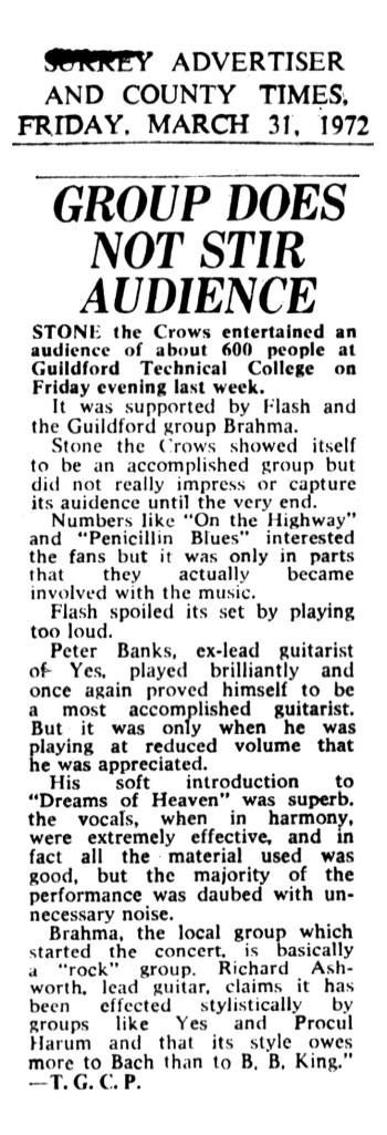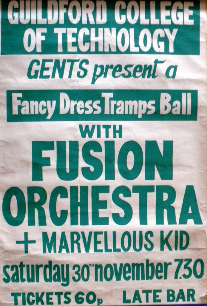 But, live music at the college kicked off before the 70’s. The first concert listing at Guildford Technical College we have located to date featured New Zealand-born baritone Bryan Drake on 14 December ’59, well attended by pupils from Prior’s Field School, who was at the Welsh National Opera at the time. A couple of years later The Stormsville Shakers performed at the college on 12 December 1962, and a few years after that we find, Moon’s Train there on 24 may ’68 and English folk rockers, Fairport Convention on 27 September ’68.