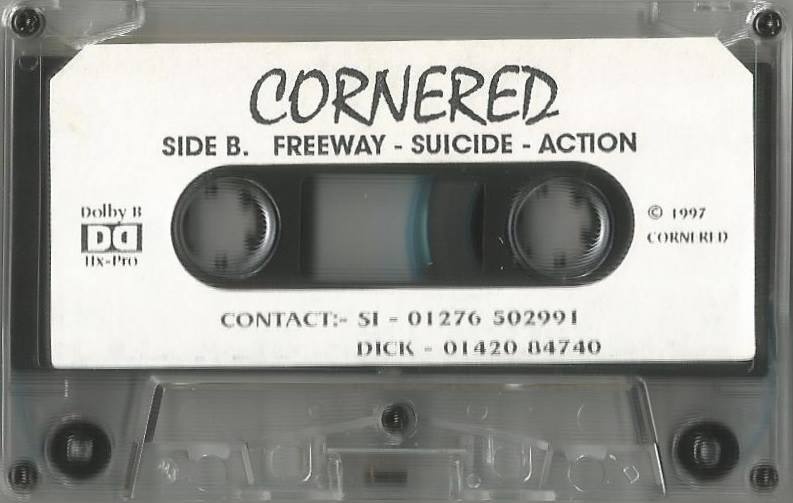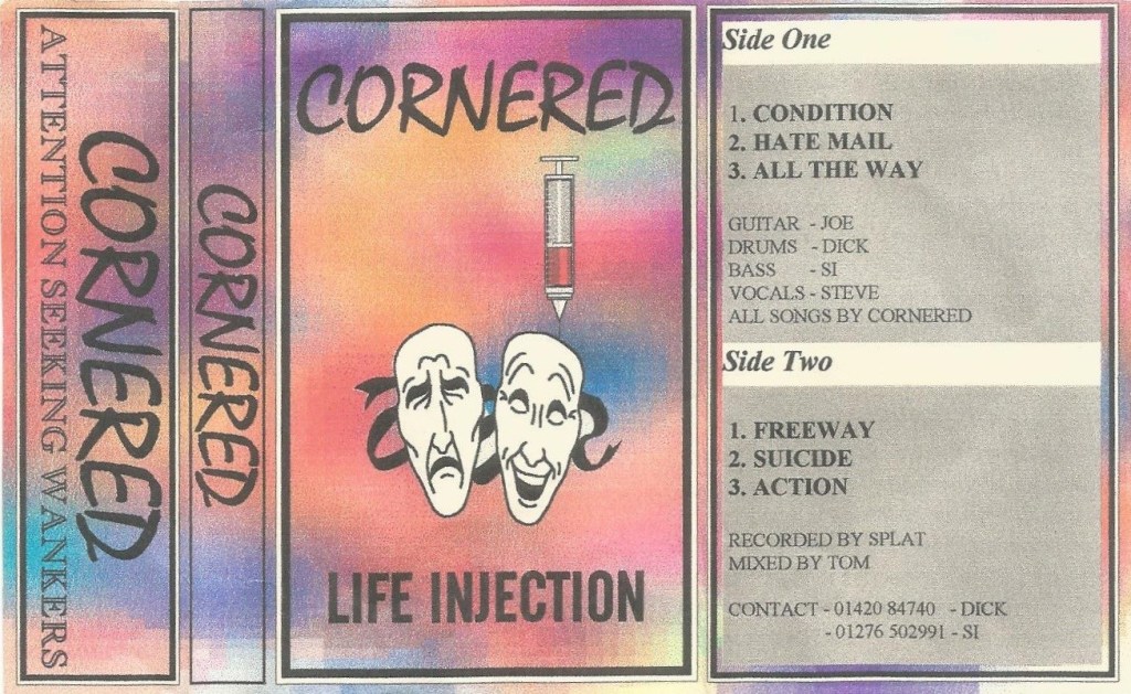 Some time in the first half on ’97 the sixth installment of Snakebite City included Cornered amongst the 25 featured bands. The band also released the “Life Injection” cassette demo in ’97 that carried six songs. Recorded by Splat, the singer with Disturbing Guests, at The Workhouse Rehearsal Studios, Aldershot on a 4-track machine, and mixed by Tom ?.