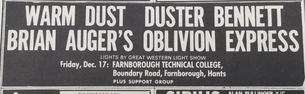 In the early 70’s rock, prog’ and otherwise, dominated the student union. Starting the concert series for 1971 was the Hammond organ trio Jody Grind on 9 January. Having toured ‘Atom Heart Mother’ around Europe and the United States in 1970, Pink Floyd graced the Tech’s stage on 13 February ’71. A month later, Stray wander onto the campus for a gig on 13 March ’71. Country rock band Cochise were supported by folk rockers Gypsy on 25 September 71, the latter refrained from miming as they had the month prior on BBC One’s Top of the Pops. Patto supported by Bell & Arc, the blues rock group consisting of Graham Bell with heavy prog rock band ARC, were there on 9 October, and Heron performed eleven days after on 20 October, followed by Barclay James Harvest on 30 October ’71. The final stop on Argent, Climax Chicago, and Duffy Power’s 32 venue ‘Triple Grand Tour’ was Farnborough Tech on 13 November ’71. Spontaneous Combustion, having opened for Emerson Lake & Palmer several times, supported Home on 11 December ’71. The Tech’s Student Union placed an advert in the 11 December Melody Maker advertising this gig and one the following Friday, 17 December ’71, featuring Duster Bennett, Warm Dust and Brian Auger’s Oblivion Express. Status Quo also rocked the venue, supported by Magic Alice, in ’71.